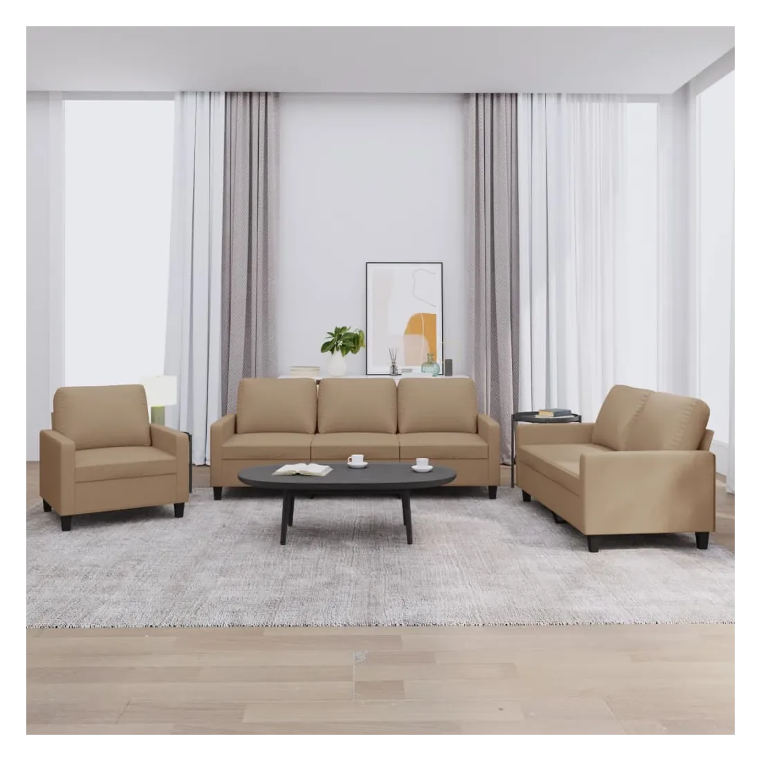 Cet ensemble de canapés est un excellent endroit pour discuter, lire, regarder la télévision ou simplement vous détendre. Il est destiné à être un point central de votre maison. Similicuir durable : le similicuir de qualité supérieure est un matériau très durable. Il est résistant aux taches, ce qui le rend facile à nettoyer avec un chiffon humide. La surface lisse donne également un aspect luxueux et la beauté du cuir véritable.Structure robuste et stable : la structure en contreplaqué et en métal du canapé assure robustesse et stabilité.Expérience d'assise confortable : le canapé est très confortable avec le siège, les accoudoirs et les oreillers de dossier bien rembourrés.Design accrocheur : doté d'un design simple mais moderne, ce siège de salon est destiné à attirer l'attention dans votre pièce.