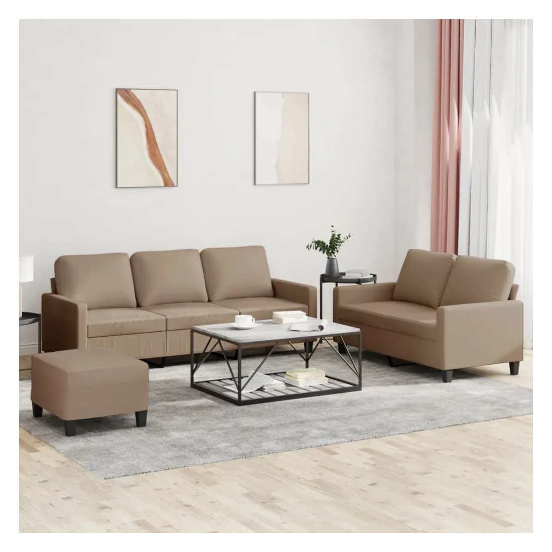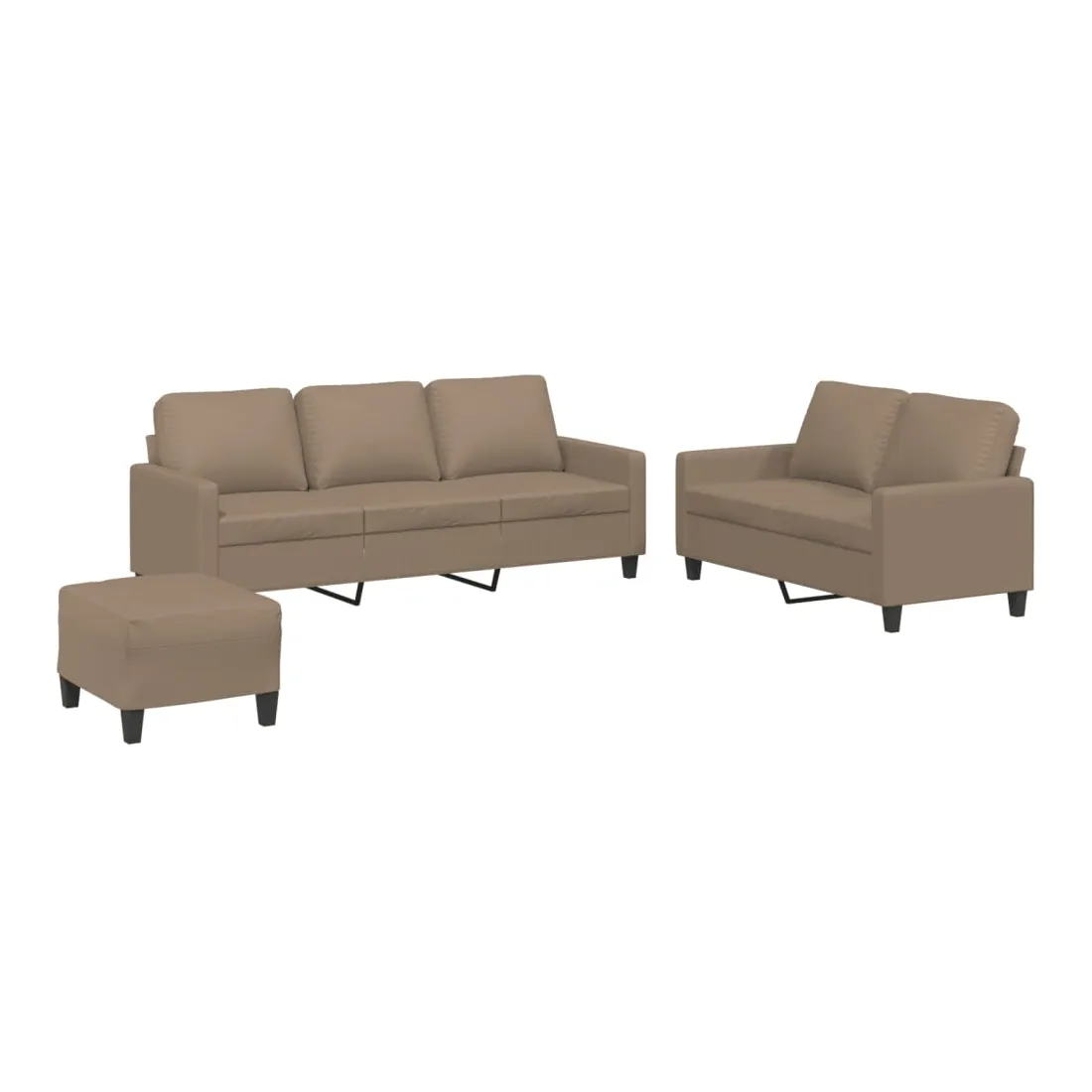 Cet ensemble de canapés est un excellent endroit pour discuter, lire, regarder la télévision ou simplement vous détendre. Il est destiné à être un point central de votre maison. Similicuir durable : le similicuir de qualité supérieure est un matériau très durable. Il est résistant aux taches, ce qui le rend facile à nettoyer avec un chiffon humide. La surface lisse donne également un aspect luxueux et la beauté du cuir véritable.Structure robuste et stable : la structure en contreplaqué et en métal du canapé assure robustesse et stabilité.Expérience d'assise confortable : le canapé est très confortable avec le siège, les accoudoirs et les oreillers de dossier bien rembourrés.Pouf polyvalent : ce repose-pied convient pour reposer vos pieds lorsque vous êtes allongé dans un canapé, ou pour vous offrir un siège supplémentaire dans votre pièce. De plus, le design simple et la taille compacte le rendent idéal pour presque tous vos espaces de vie.