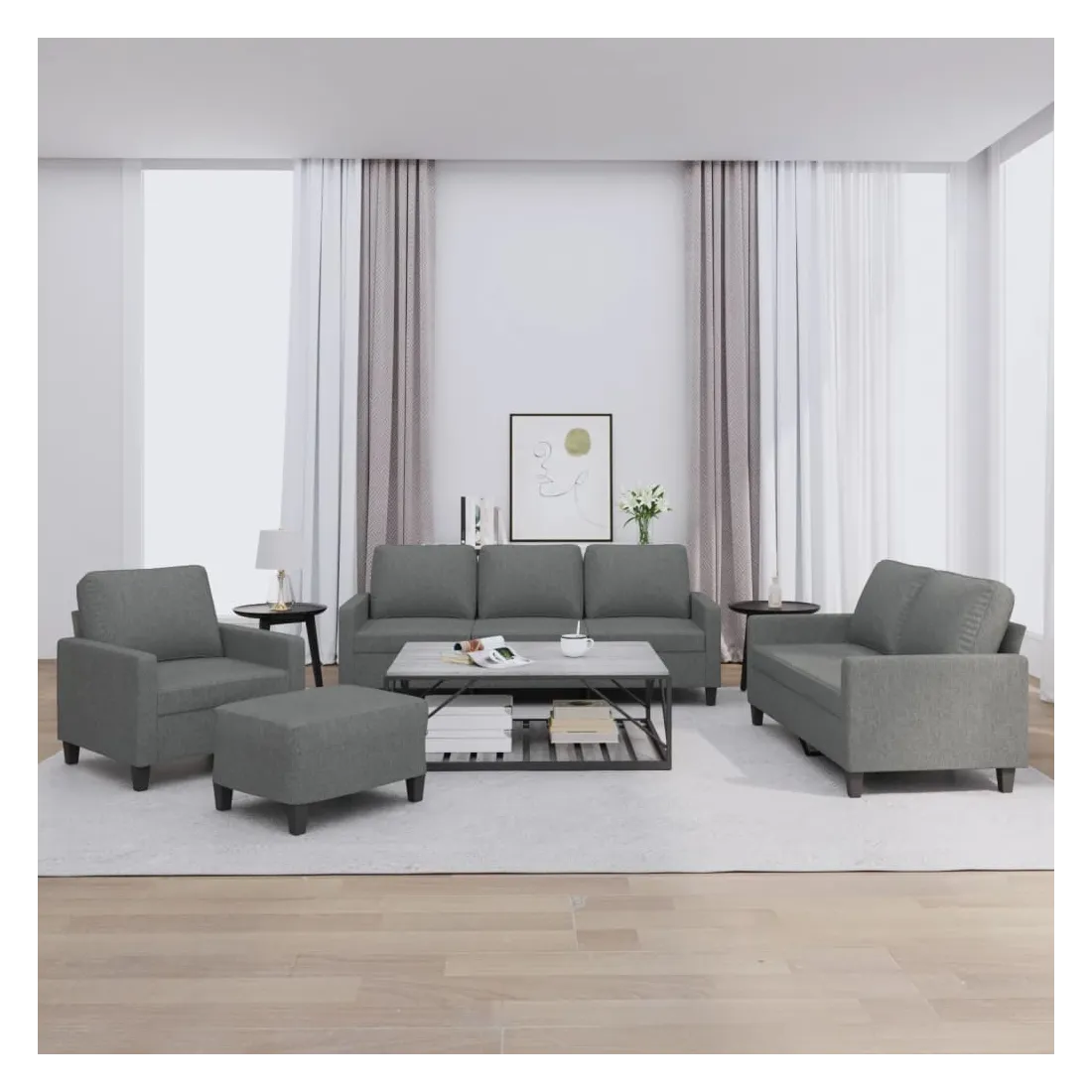 Cet ensemble de canapés est un excellent endroit pour discuter, lire, regarder la télévision ou simplement vous détendre. Il est destiné à être un point central de votre maison. Tissu durable : le tissu présente un aspect simple et épuré tout en restant respirant et durable.Structure robuste et stable : la structure en contreplaqué et en métal du canapé assure robustesse et stabilité.Expérience d'assise confortable : le canapé est très confortable avec le siège, les accoudoirs et les oreillers de dossier bien rembourrés.Pouf polyvalent : ce repose-pied convient pour reposer vos pieds lorsque vous êtes allongé dans un canapé, ou pour vous offrir un siège supplémentaire dans votre pièce. De plus, le design simple et la taille compacte le rendent idéal pour presque tous vos espaces de vie.