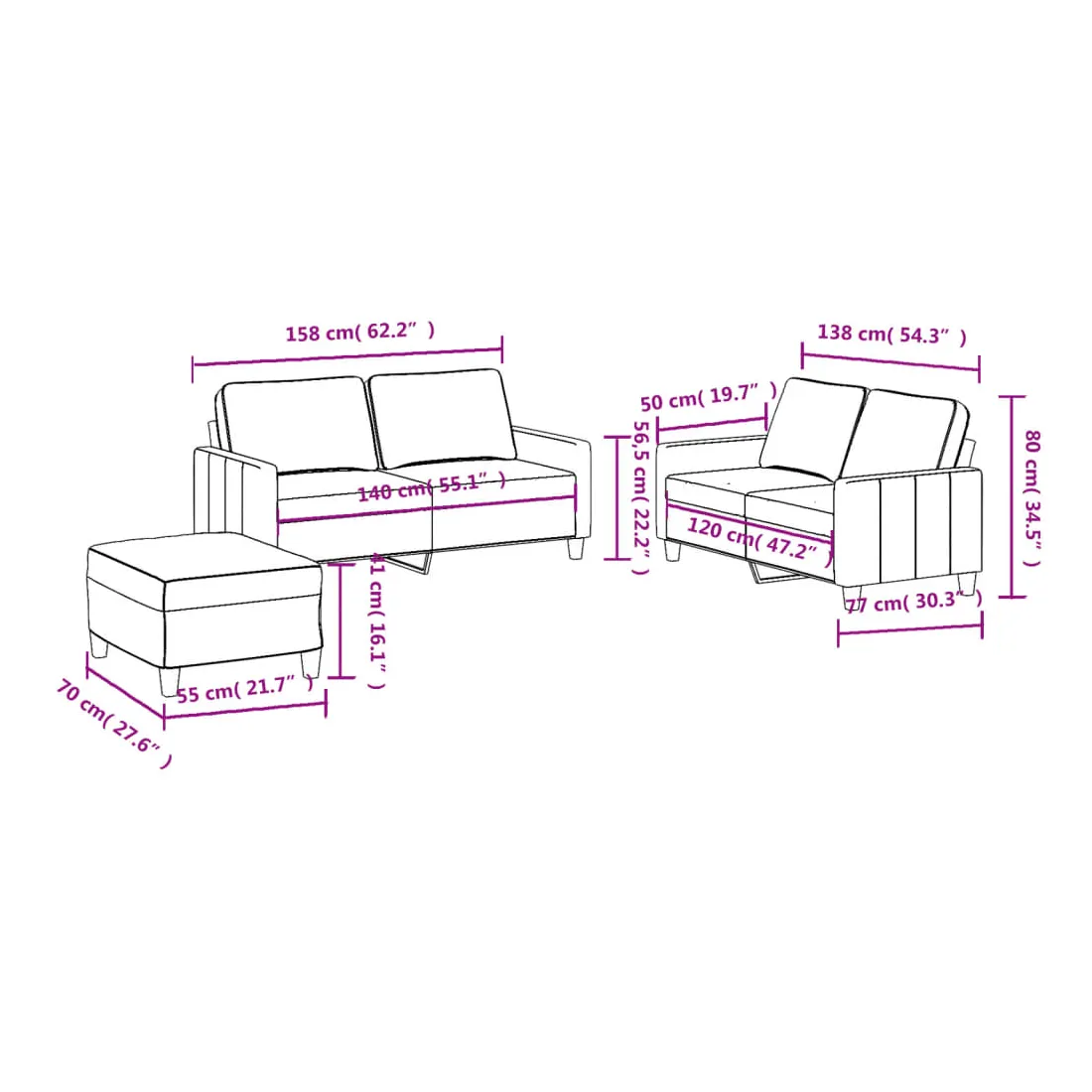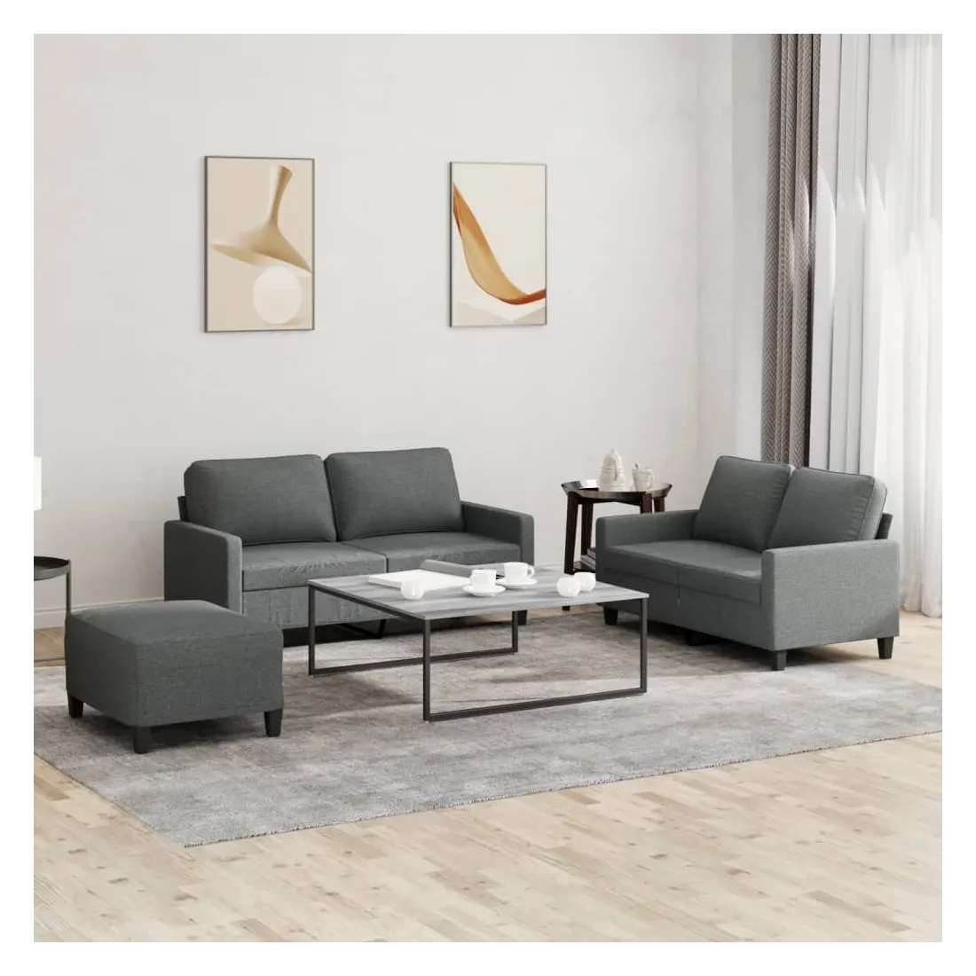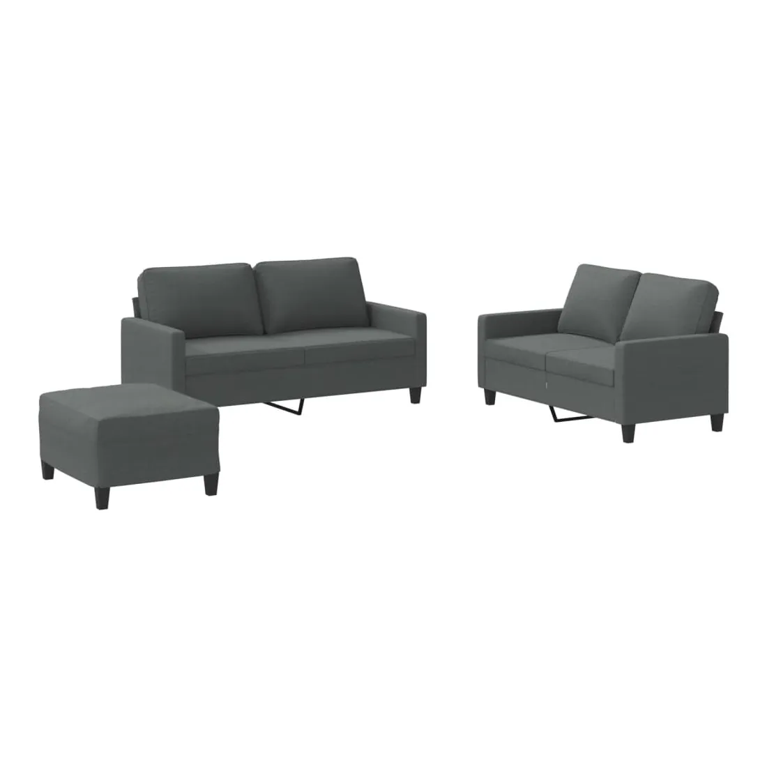 Cet ensemble de canapés est un excellent endroit pour discuter, lire, regarder la télévision ou simplement vous détendre. Il est destiné à être un point central de votre maison. Tissu durable : le tissu présente un aspect simple et épuré tout en restant respirant et durable.Structure robuste et stable : la structure en contreplaqué et en métal du canapé assure robustesse et stabilité.Expérience d'assise confortable : le canapé est très confortable grâce au siège et aux accoudoirs épais et rembourrés.Pouf polyvalent : ce repose-pied convient pour reposer vos pieds lorsque vous êtes allongé dans un canapé, ou pour vous offrir un siège supplémentaire dans votre pièce. De plus, le design simple et la taille compacte le rendent idéal pour presque tous vos espaces de vie.