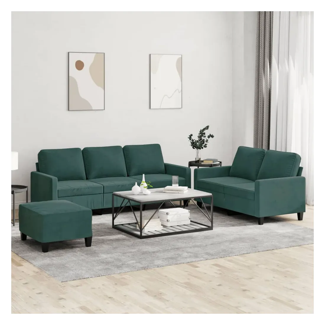 Cet ensemble de canapés est un excellent endroit pour discuter, lire, regarder la télévision ou simplement vous détendre. Il est destiné à être un point central de votre maison. Velours doux : le velours est un tissu doux et confortable, agréable au toucher.Structure robuste et stable : la structure en contreplaqué et en métal du canapé assure robustesse et stabilité.Expérience d'assise confortable : le canapé est très confortable grâce au siège et aux accoudoirs épais et rembourrés.Pouf polyvalent : ce repose-pied convient pour reposer vos pieds lorsque vous êtes allongé dans un canapé, ou pour vous offrir un siège supplémentaire dans votre pièce. De plus, le design simple et la taille compacte le rendent idéal pour presque tous vos espaces de vie.