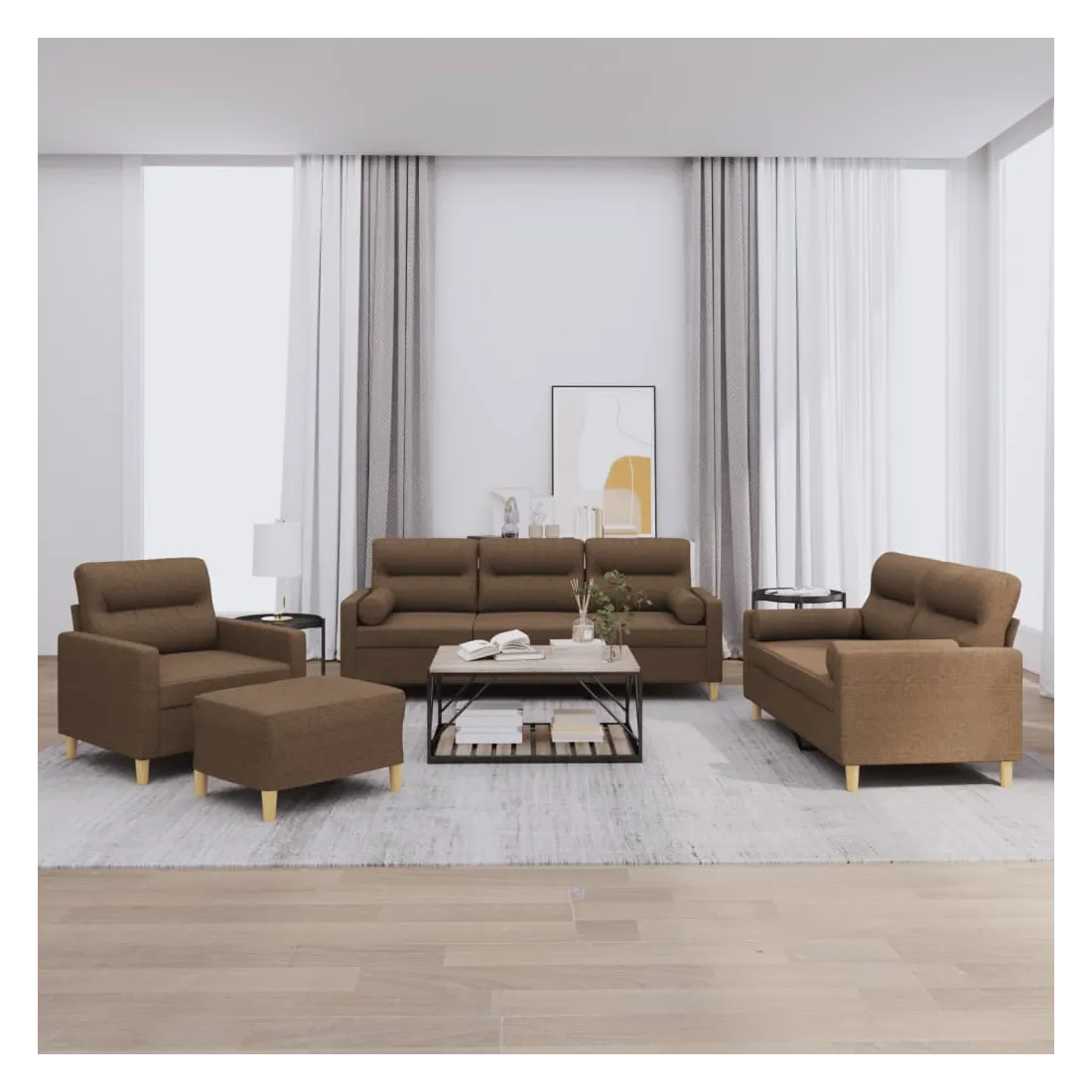 Cet ensemble de canapés est un excellent endroit pour discuter, lire, regarder la télévision ou simplement vous détendre. Il est destiné à être un point central de votre maison. Tissu durable : le tissu présente un aspect simple et épuré tout en restant respirant et durable.Structure robuste et stable : la structure en contreplaqué et en métal du canapé assure robustesse et stabilité.Expérience d'assise confortable : le canapé est très confortable avec le siège, les accoudoirs et les oreillers de dossier bien rembourrés.Oreillers cylindriques pratiques : ces oreillers cylindriques non seulement embellissent votre décor, mais ils peuvent également apporter un confort supplémentaire lorsque vous êtes assis ou allongé.Pouf polyvalent : ce repose-pied convient pour reposer vos pieds lorsque vous êtes allongé dans un canapé, ou pour vous offrir un siège supplémentaire dans votre pièce. De plus, le design simple et la taille compacte le rendent idéal pour presque tous vos espaces de vie.