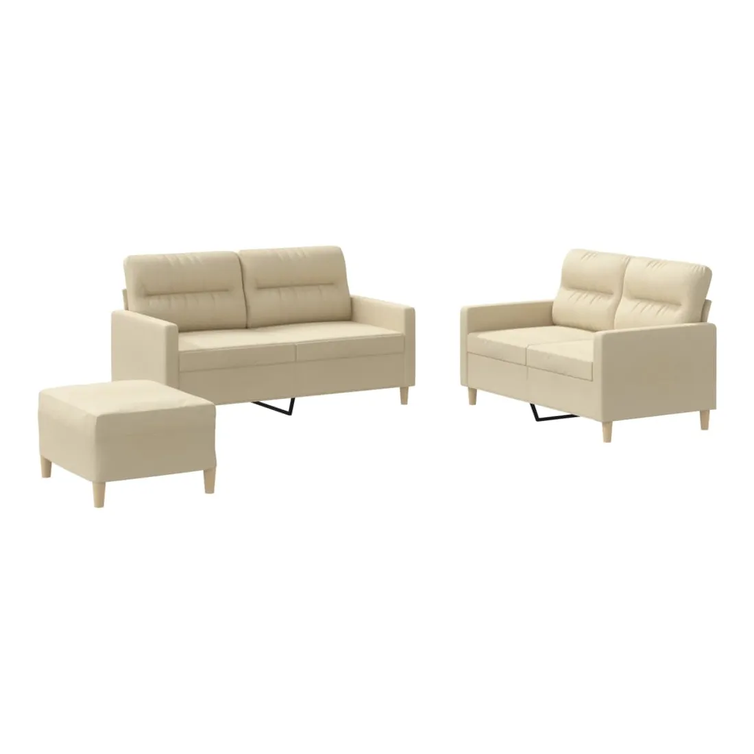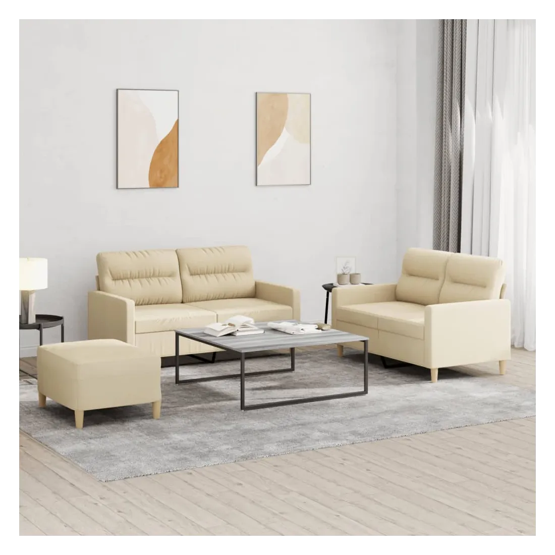 Cet ensemble de canapés est un excellent endroit pour discuter, lire, regarder la télévision ou simplement vous détendre. Il est destiné à être un point central de votre maison. Tissu durable : le tissu présente un aspect simple et épuré tout en restant respirant et durable.Structure robuste et stable : la structure en contreplaqué et en métal du canapé assure robustesse et stabilité.Expérience d'assise confortable : le canapé est très confortable grâce au siège et aux accoudoirs épais et rembourrés.Pouf polyvalent : ce repose-pied convient pour reposer vos pieds lorsque vous êtes allongé dans un canapé, ou pour vous offrir un siège supplémentaire dans votre pièce. De plus, le design simple et la taille compacte le rendent idéal pour presque tous vos espaces de vie.