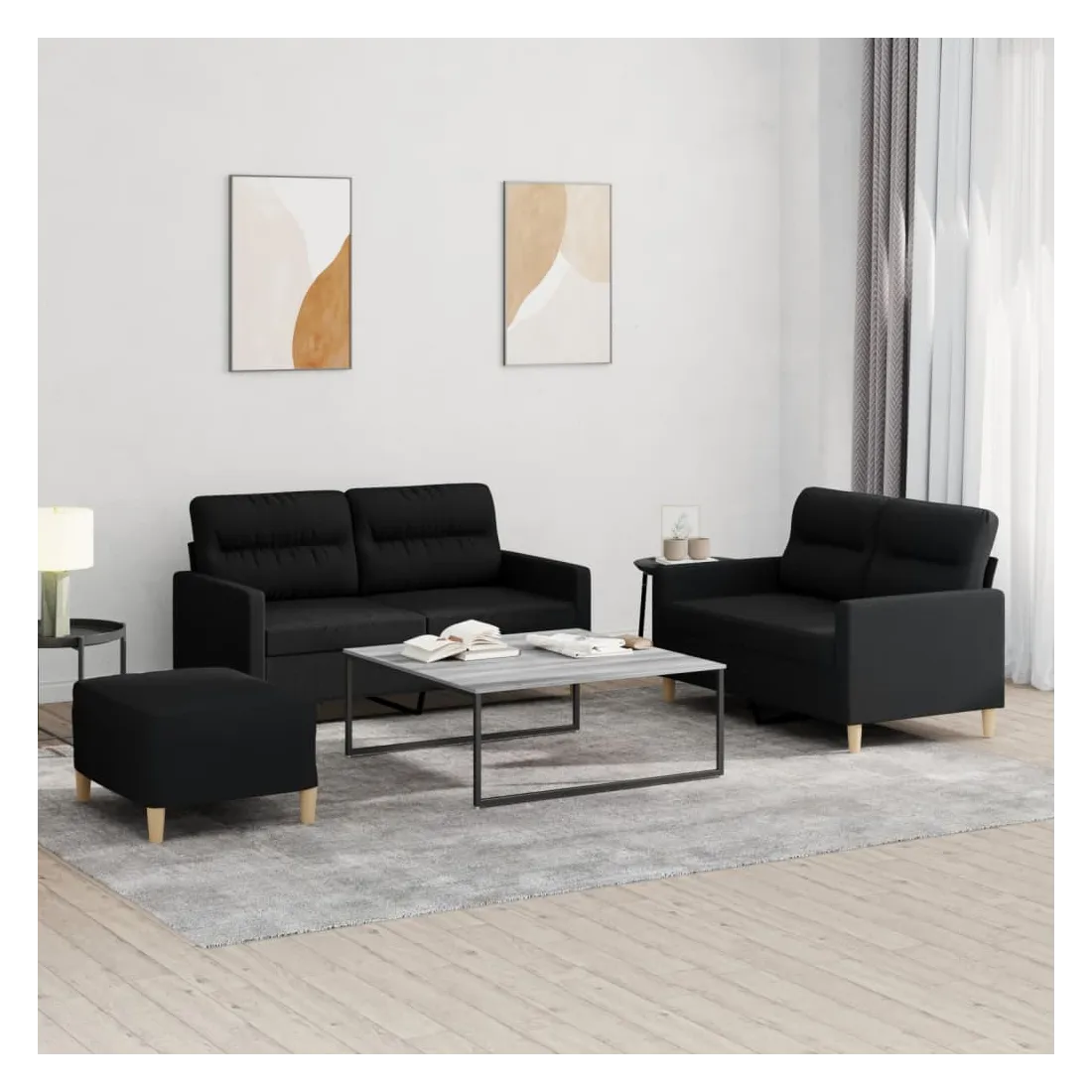 Cet ensemble de canapés est un excellent endroit pour discuter, lire, regarder la télévision ou simplement vous détendre. Il est destiné à être un point central de votre maison. Tissu durable : le tissu présente un aspect simple et épuré tout en restant respirant et durable.Structure robuste et stable : la structure en contreplaqué et en métal du canapé assure robustesse et stabilité.Expérience d'assise confortable : le canapé est très confortable grâce au siège et aux accoudoirs épais et rembourrés.Pouf polyvalent : ce repose-pied convient pour reposer vos pieds lorsque vous êtes allongé dans un canapé, ou pour vous offrir un siège supplémentaire dans votre pièce. De plus, le design simple et la taille compacte le rendent idéal pour presque tous vos espaces de vie.