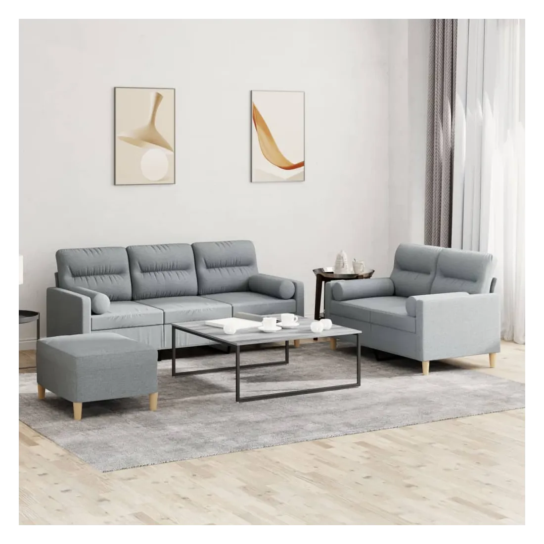 Cet ensemble de canapés est un excellent endroit pour discuter, lire, regarder la télévision ou simplement vous détendre. Il est destiné à être un point central de votre maison. Tissu durable : le tissu présente un aspect simple et épuré tout en restant respirant et durable.Structure robuste et stable : la structure en contreplaqué et en métal du canapé assure robustesse et stabilité.Expérience d'assise confortable : le canapé est très confortable grâce au siège et aux accoudoirs épais et rembourrés.Oreillers cylindriques pratiques : ces oreillers cylindriques non seulement embellissent votre décor, mais ils peuvent également apporter un confort supplémentaire lorsque vous êtes assis ou allongé.Pouf polyvalent : ce repose-pied convient pour reposer vos pieds lorsque vous êtes allongé dans un canapé, ou pour vous offrir un siège supplémentaire dans votre pièce. De plus, le design simple et la taille compacte le rendent idéal pour presque tous vos espaces de vie.