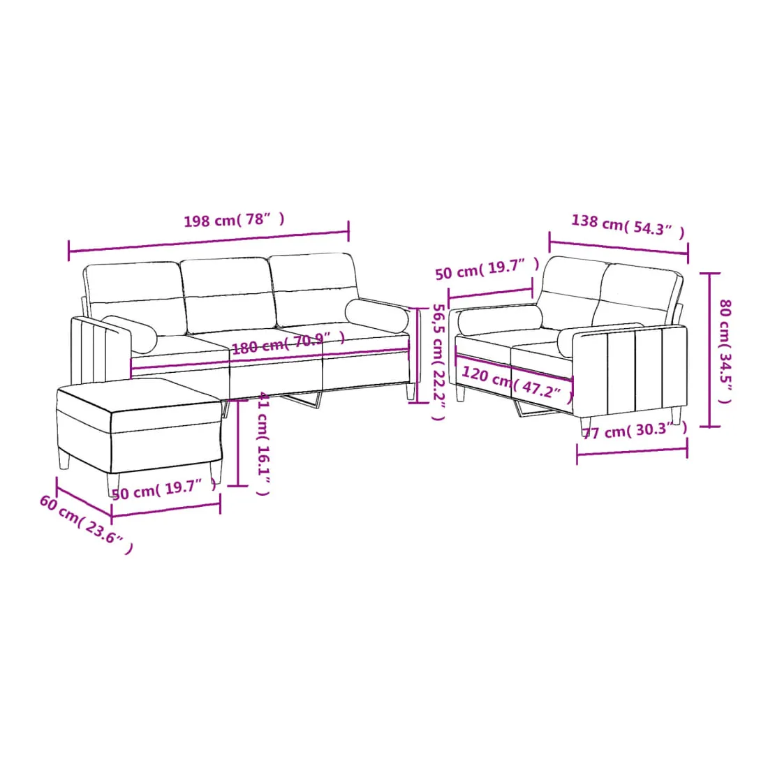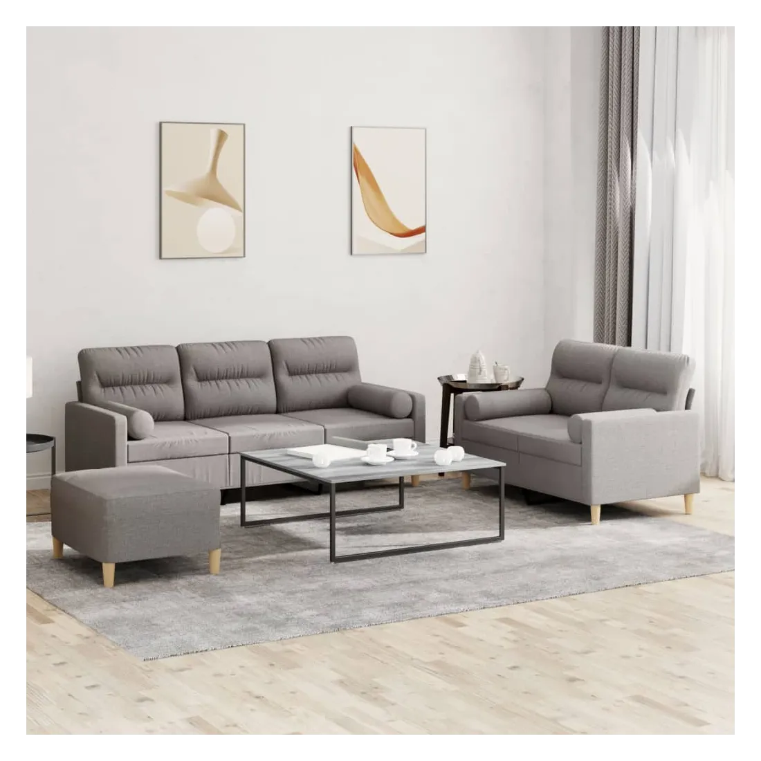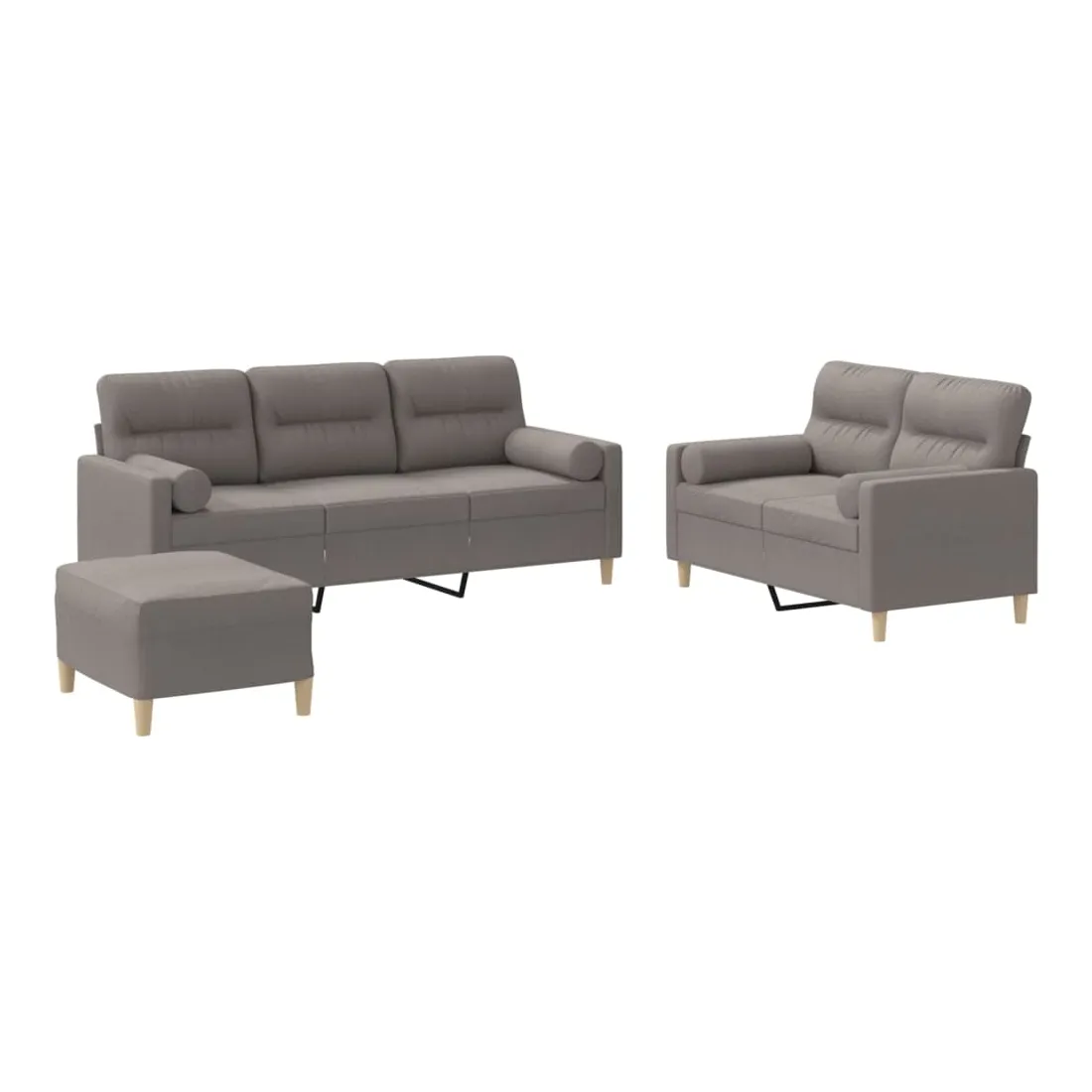 Cet ensemble de canapés est un excellent endroit pour discuter, lire, regarder la télévision ou simplement vous détendre. Il est destiné à être un point central de votre maison. Tissu durable : le tissu présente un aspect simple et épuré tout en restant respirant et durable.Structure robuste et stable : la structure en contreplaqué et en métal du canapé assure robustesse et stabilité.Expérience d'assise confortable : le canapé est très confortable grâce au siège et aux accoudoirs épais et rembourrés.Oreillers cylindriques pratiques : ces oreillers cylindriques non seulement embellissent votre décor, mais ils peuvent également apporter un confort supplémentaire lorsque vous êtes assis ou allongé.Pouf polyvalent : ce repose-pied convient pour reposer vos pieds lorsque vous êtes allongé dans un canapé, ou pour vous offrir un siège supplémentaire dans votre pièce. De plus, le design simple et la taille compacte le rendent idéal pour presque tous vos espaces de vie.