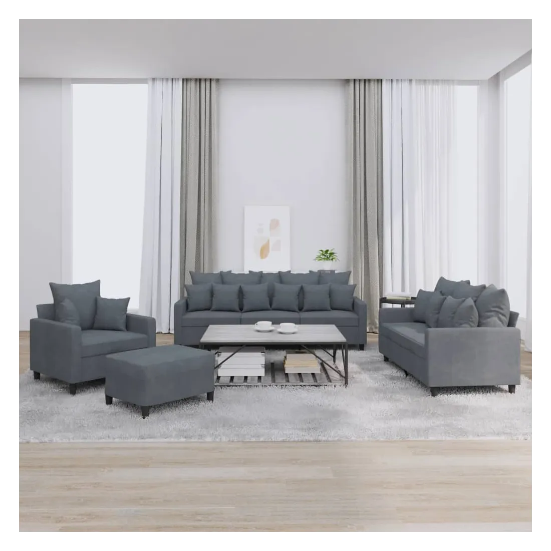 Cet ensemble de canapés est un excellent endroit pour discuter, lire, regarder la télévision ou simplement vous détendre. Il est destiné à être un point central de votre maison. Velours doux : le velours est un tissu doux et confortable, agréable au toucher.Structure robuste et stable : la structure en contreplaqué et en métal du canapé assure robustesse et stabilité. Expérience d'assise confortable : le canapé est très confortable avec le siège, les accoudoirs et les oreillers de dossier bien rembourrés.Pouf polyvalent : ce repose-pied convient pour reposer vos pieds lorsque vous êtes allongé dans un canapé ou pour vous offrir un siège supplémentaire dans votre pièce. De plus, le design simple et la taille compacte le rendent idéal pour presque tous vos espaces de vie.