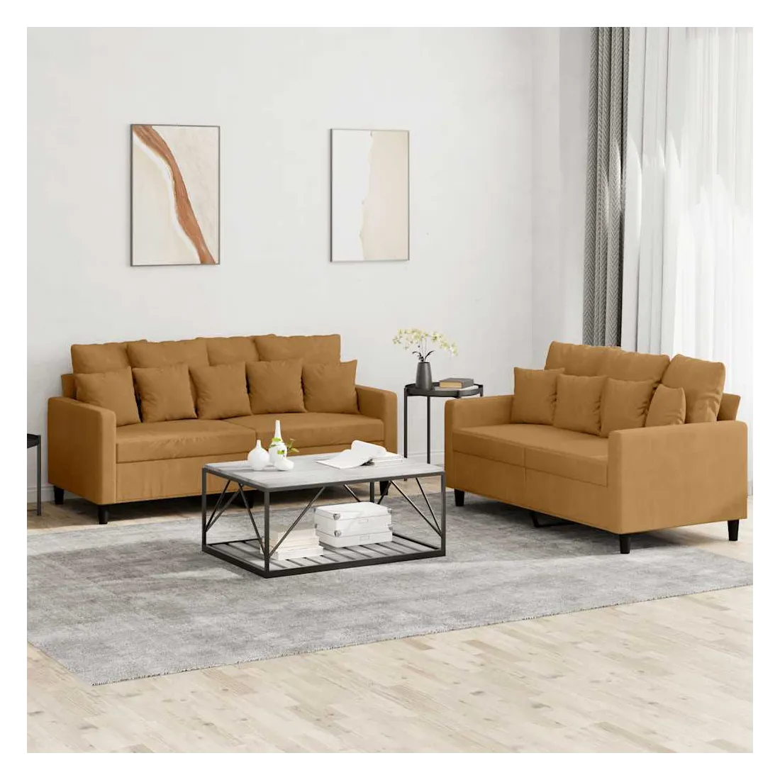 Cet ensemble de canapés est un excellent endroit pour discuter, lire, regarder la télévision ou simplement vous détendre. Il est destiné à être un point central de votre maison. Velours doux : le velours est un tissu doux et confortable, agréable au toucher. Structure robuste et stable : la structure en contreplaqué et en métal du canapé assure robustesse et stabilité. Expérience d'assise confortable : le canapé est très confortable avec le siège, les accoudoirs et les oreillers de dossier bien rembourrés.
