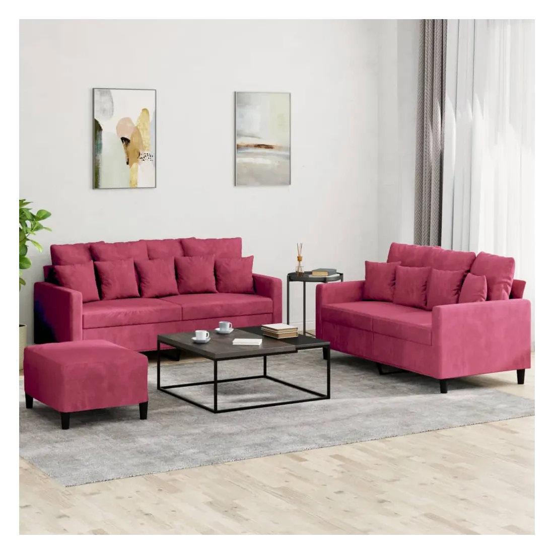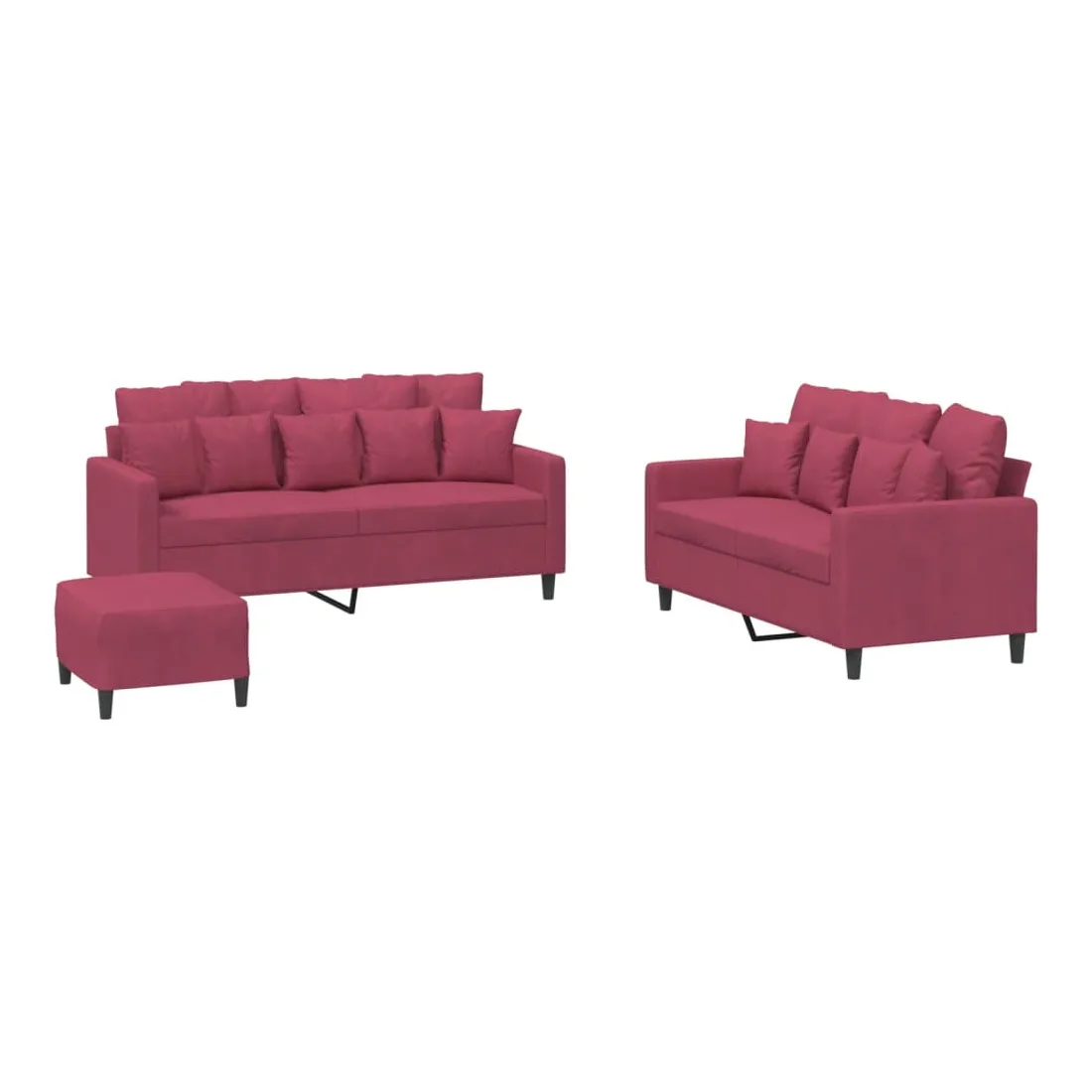 Cet ensemble de canapés est un excellent endroit pour discuter, lire, regarder la télévision ou simplement vous détendre. Il est destiné à être un point central de votre maison. Velours doux : le velours est un tissu doux et confortable, agréable au toucher.Structure robuste et stable : la structure en contreplaqué et en métal du canapé assure robustesse et stabilité. Expérience d'assise confortable : le canapé est très confortable avec le siège, les accoudoirs et les oreillers de dossier bien rembourrés.Pouf polyvalent : ce repose-pied convient pour reposer vos pieds lorsque vous êtes allongé dans un canapé ou pour vous offrir un siège supplémentaire dans votre pièce. De plus, le design simple et la taille compacte le rendent idéal pour presque tous vos espaces de vie.
