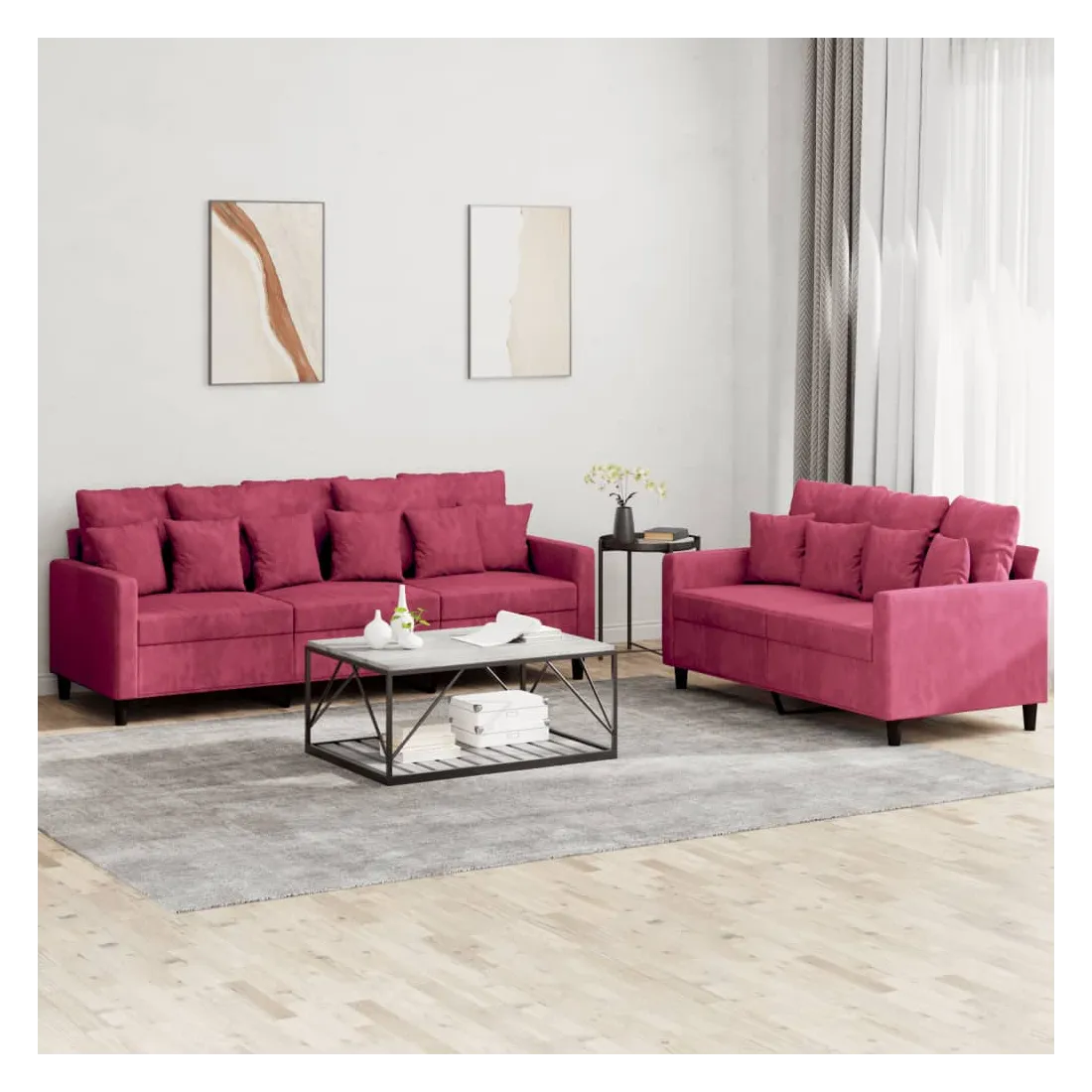 Cet ensemble de canapés est un excellent endroit pour discuter, lire, regarder la télévision ou simplement vous détendre. Il est destiné à être un point central de votre maison. Velours doux : le velours est un tissu doux et confortable, agréable au toucher. Structure robuste et stable : la structure en contreplaqué et en métal du canapé assure robustesse et stabilité. Expérience d'assise confortable : le canapé est très confortable avec le siège, les accoudoirs et les oreillers de dossier bien rembourrés.