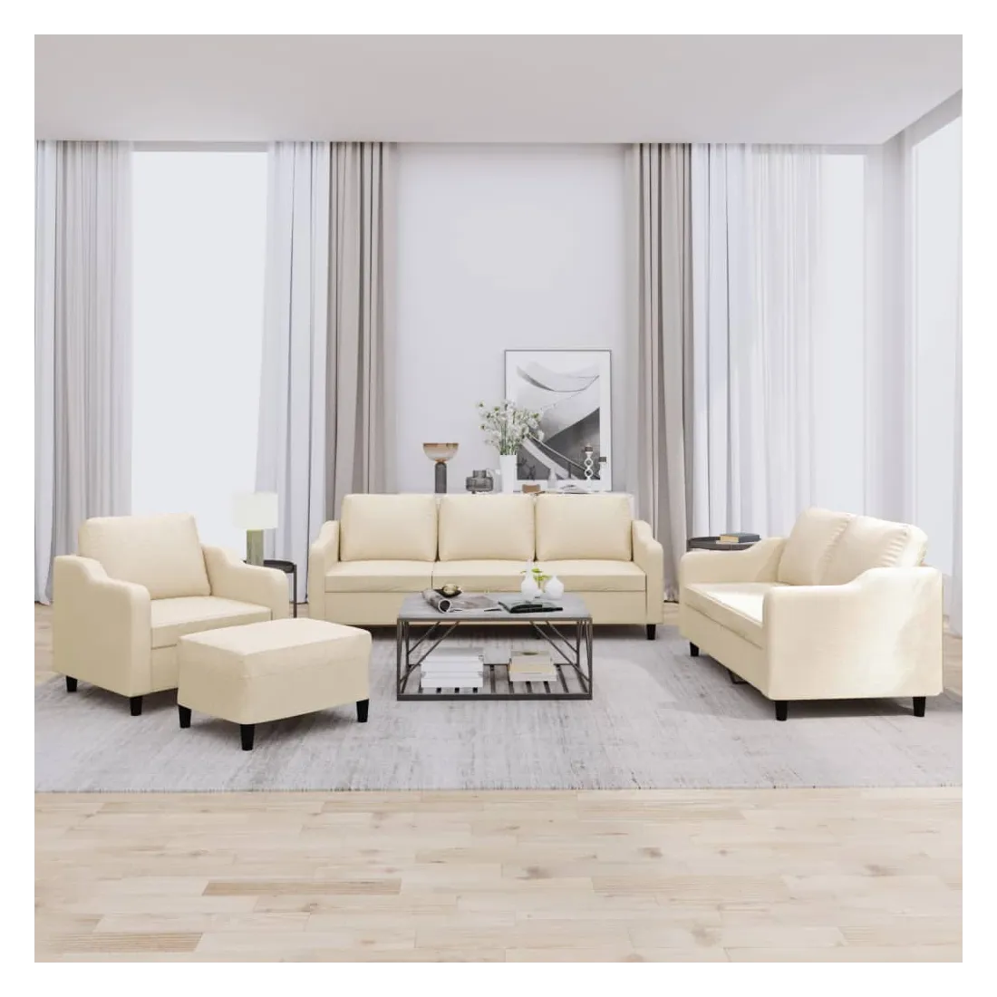 Cet ensemble de canapés est un excellent endroit pour discuter, lire, regarder la télévision ou simplement vous détendre. Il est destiné à être un point central de votre maison. Tissu durable : le tissu présente un aspect simple et épuré tout en restant respirant et durable.Structure robuste et stable : la structure en contreplaqué et en métal du canapé assure robustesse et stabilité. Expérience d'assise confortable : le canapé est très confortable avec le siège, les accoudoirs et les oreillers de dossier bien rembourrés. Pouf polyvalent : ce repose-pied convient pour reposer vos pieds lorsque vous êtes allongé dans un canapé ou pour vous offrir un siège supplémentaire dans votre pièce. De plus, le design simple et la taille compacte le rendent idéal pour presque tous vos espaces de vie.
