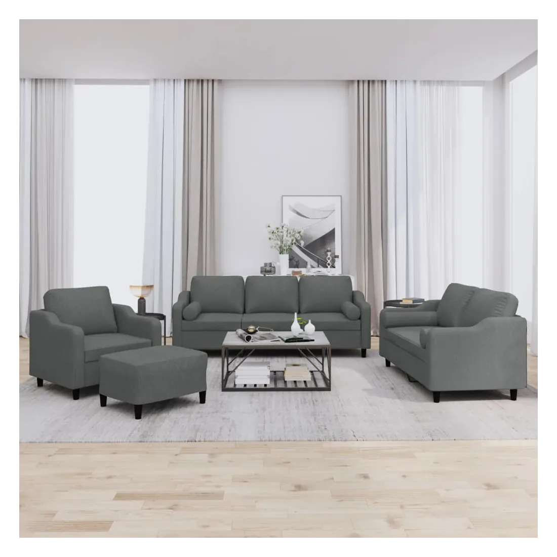 Cet ensemble de canapés est un excellent endroit pour discuter, lire, regarder la télévision ou simplement vous détendre. Il est destiné à être un point central de votre maison. Tissu durable : le tissu présente un aspect simple et épuré tout en restant respirant et durable.Structure robuste et stable : la structure en contreplaqué et en métal du canapé assure robustesse et stabilité. Expérience d'assise confortable : le canapé est très confortable avec le siège, les accoudoirs et les oreillers de dossier bien rembourrés. Oreillers cylindriques pratiques : ces oreillers cylindriques non seulement embellissent votre décor mais ils peuvent également apporter un confort supplémentaire lorsque vous êtes assis ou allongé. Pouf polyvalent : ce repose-pied convient pour reposer vos pieds lorsque vous êtes allongé dans un canapé ou pour vous offrir un siège supplémentaire dans votre pièce. De plus, le design simple et la taille compacte le rendent idéal pour presque tous vos espaces de vie.
