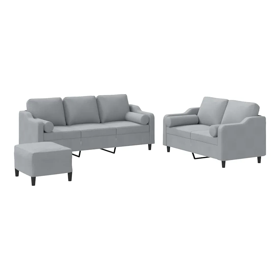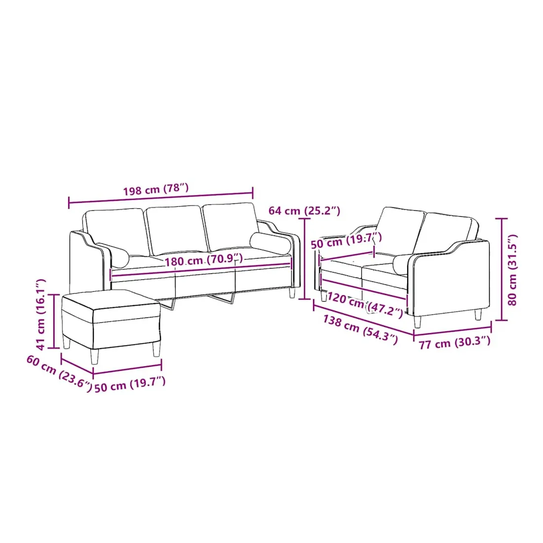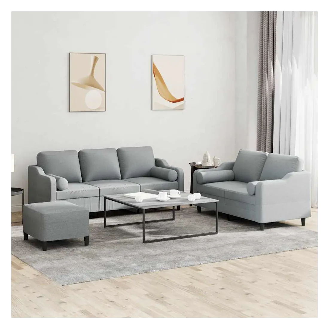 Cet ensemble de canapés est un excellent endroit pour discuter, lire, regarder la télévision ou simplement vous détendre. Il est destiné à être un point central de votre maison. Tissu durable : le tissu présente un aspect simple et épuré tout en restant respirant et durable.Structure robuste et stable : la structure en contreplaqué et en métal du canapé assure robustesse et stabilité. Expérience d'assise confortable : le canapé est très confortable avec le siège, les accoudoirs et les oreillers de dossier bien rembourrés. Oreillers cylindriques pratiques : ces oreillers cylindriques non seulement embellissent votre décor mais ils peuvent également apporter un confort supplémentaire lorsque vous êtes assis ou allongé. Pouf polyvalent : ce repose-pied convient pour reposer vos pieds lorsque vous êtes allongé dans un canapé ou pour vous offrir un siège supplémentaire dans votre pièce. De plus, le design simple et la taille compacte le rendent idéal pour presque tous vos espaces de vie.
