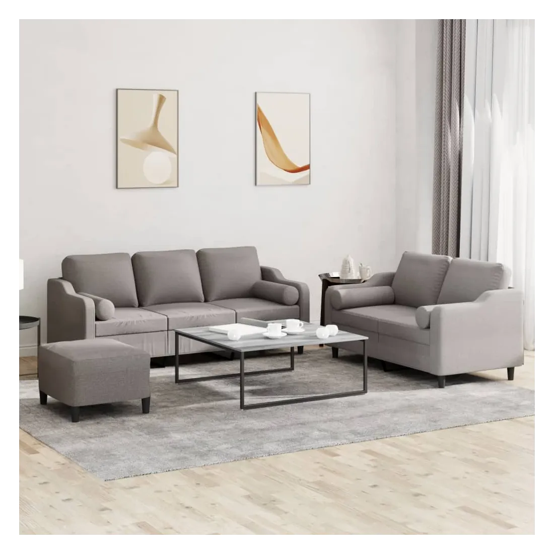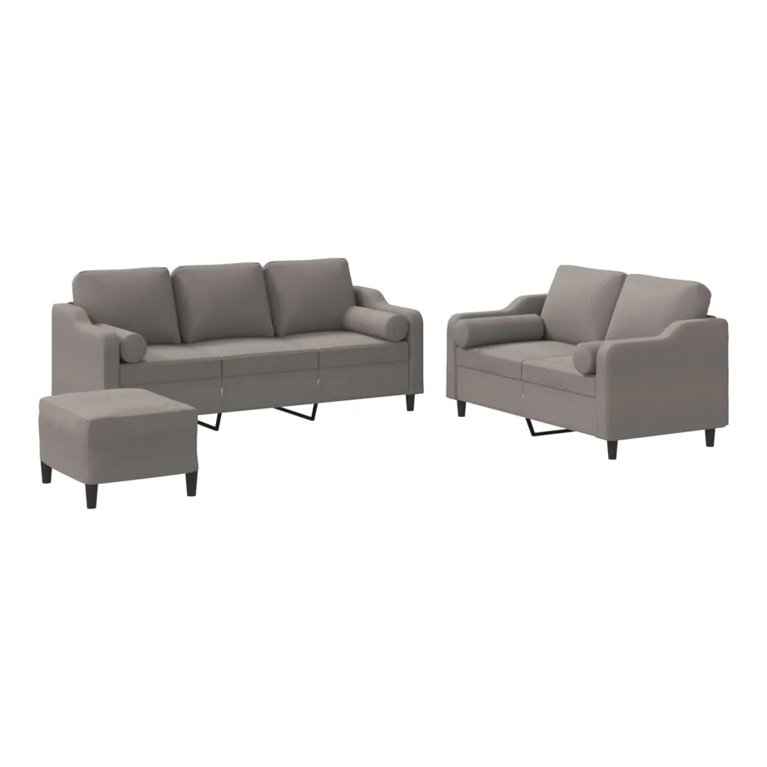 Cet ensemble de canapés est un excellent endroit pour discuter, lire, regarder la télévision ou simplement vous détendre. Il est destiné à être un point central de votre maison. Tissu durable : le tissu présente un aspect simple et épuré tout en restant respirant et durable.Structure robuste et stable : la structure en contreplaqué et en métal du canapé assure robustesse et stabilité. Expérience d'assise confortable : le canapé est très confortable avec le siège, les accoudoirs et les oreillers de dossier bien rembourrés. Oreillers cylindriques pratiques : ces oreillers cylindriques non seulement embellissent votre décor mais ils peuvent également apporter un confort supplémentaire lorsque vous êtes assis ou allongé. Pouf polyvalent : ce repose-pied convient pour reposer vos pieds lorsque vous êtes allongé dans un canapé ou pour vous offrir un siège supplémentaire dans votre pièce. De plus, le design simple et la taille compacte le rendent idéal pour presque tous vos espaces de vie.