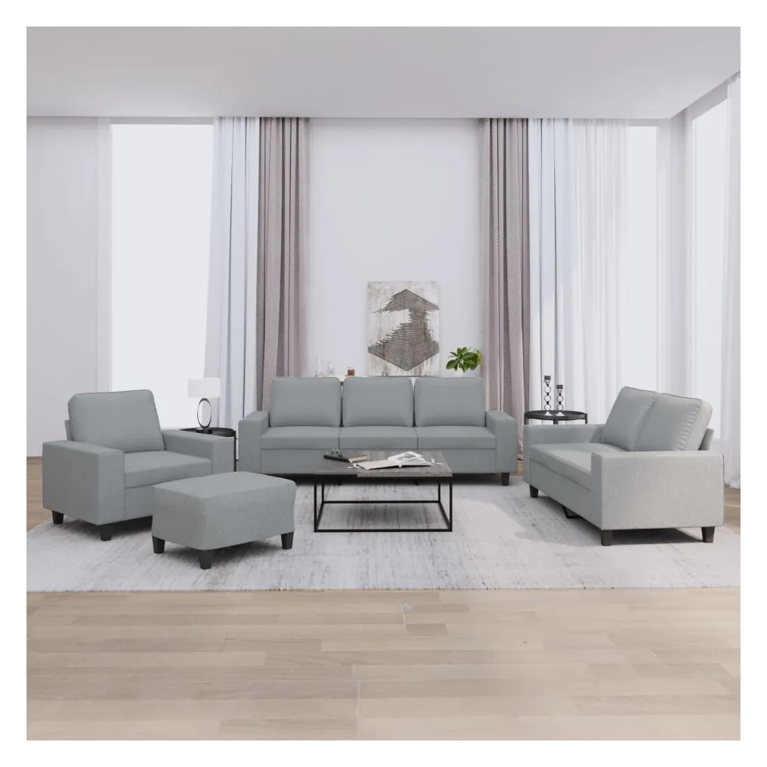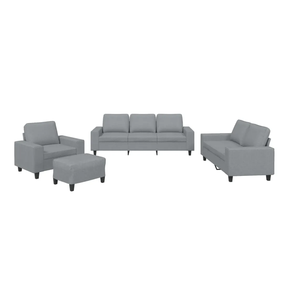 Cet ensemble de canapés est un excellent endroit pour discuter, lire, regarder la télévision ou simplement vous détendre. Il est destiné à être un point central de votre maison. Tissu durable : le tissu présente un aspect simple et épuré tout en restant respirant et durable.Structure robuste et stable : la structure en contreplaqué et en métal du canapé assure robustesse et stabilité.Expérience d'assise confortable : le canapé est très confortable avec le siège, les accoudoirs et les oreillers de dossier bien rembourrés.Pouf polyvalent : ce repose-pied convient pour reposer vos pieds lorsque vous êtes allongé dans un canapé ou pour vous offrir un siège supplémentaire dans votre pièce. De plus, le design simple et la taille compacte le rendent idéal pour presque tous vos espaces de vie.