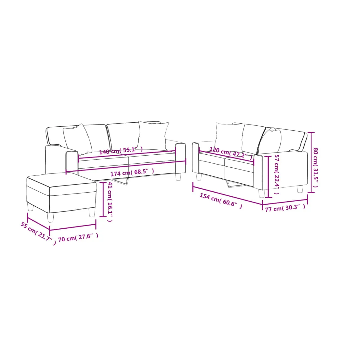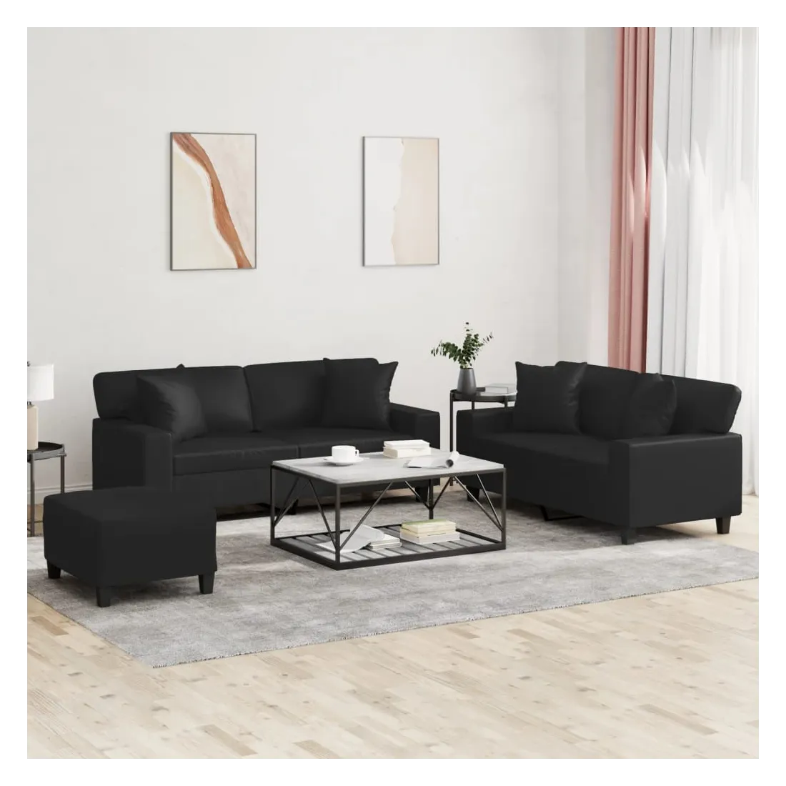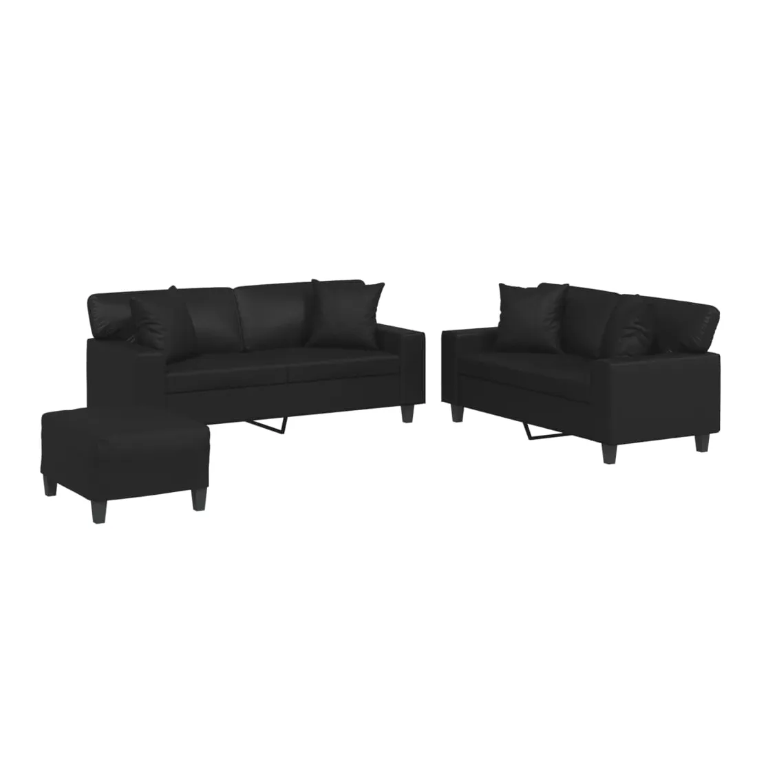 Cet ensemble de canapés est un excellent endroit pour discuter, lire, regarder la télévision ou simplement vous détendre. Il est destiné à être un point central de votre maison. Similicuir durable : le similicuir est un matériau très durable. Il est résistant aux taches, ce qui le rend facile à nettoyer avec un chiffon humide. La surface lisse donne également un aspect luxueux et la beauté du cuir véritable.Structure robuste et stable : la structure en contreplaqué et en métal du canapé assure robustesse et stabilité.Expérience d'assise confortable : le canapé est très confortable avec le siège, les accoudoirs et les oreillers de dossier bien rembourrés.Oreillers de canapé pratiques : ces oreillers décoratifs carrés non seulement embellissent votre décor mais ils peuvent également apporter un confort supplémentaire lorsque vous êtes assis ou allongé.Pouf polyvalent : ce repose-pied convient pour reposer vos pieds lorsque vous êtes allongé dans un canapé ou pour vous offrir un siège supplémentaire dans votre pièce. De plus, le design simple et la taille compacte le rendent idéal pour presque tous vos espaces de vie.