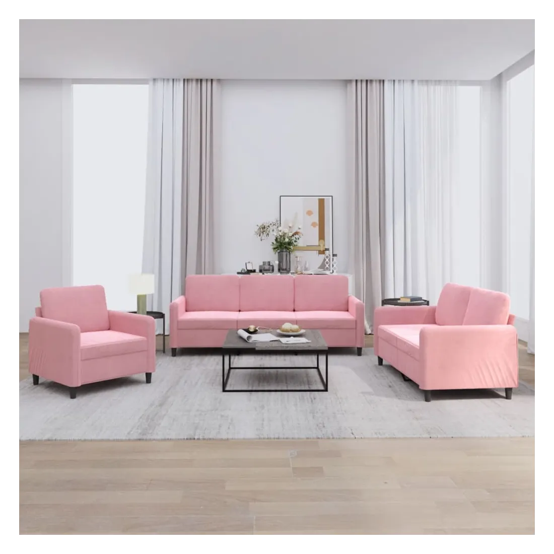 Cet ensemble de canapés est un excellent endroit pour discuter, lire, regarder la télévision ou simplement vous détendre. Il est destiné à être un point central de votre maison. Velours doux : le velours est un tissu doux et confortable, agréable au toucher.Structure robuste et stable : la structure en contreplaqué et en métal du canapé assure robustesse et stabilité.Expérience d'assise confortable : le canapé est très confortable avec le siège, les accoudoirs et les oreillers de dossier bien rembourrés.