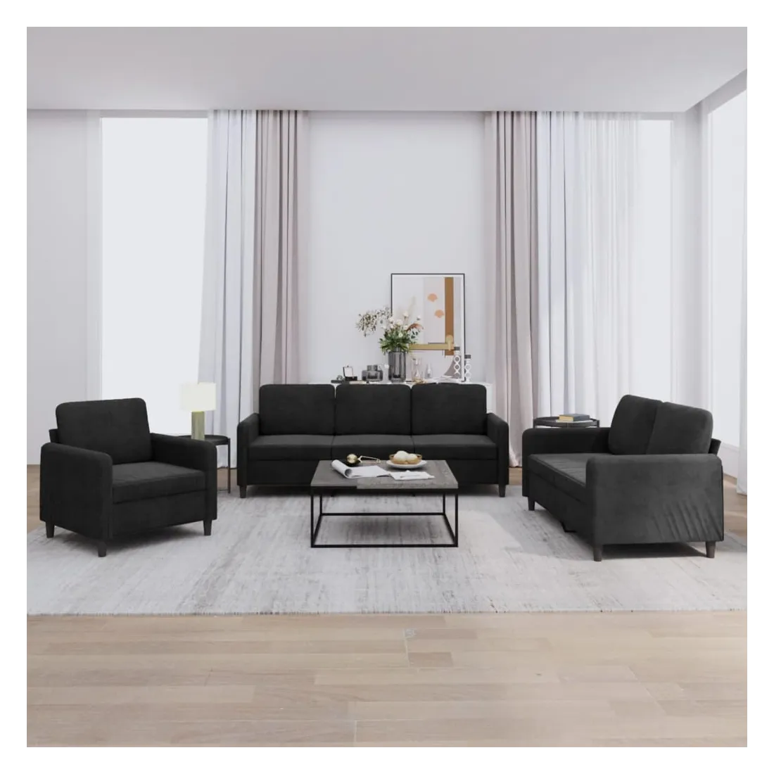 Cet ensemble de canapés est un excellent endroit pour discuter, lire, regarder la télévision ou simplement vous détendre. Il est destiné à être un point central de votre maison. Velours doux : le velours est un tissu doux et confortable, agréable au toucher.Structure robuste et stable : la structure en contreplaqué et en métal du canapé assure robustesse et stabilité.Expérience d'assise confortable : le canapé est très confortable avec le siège, les accoudoirs et les oreillers de dossier bien rembourrés.