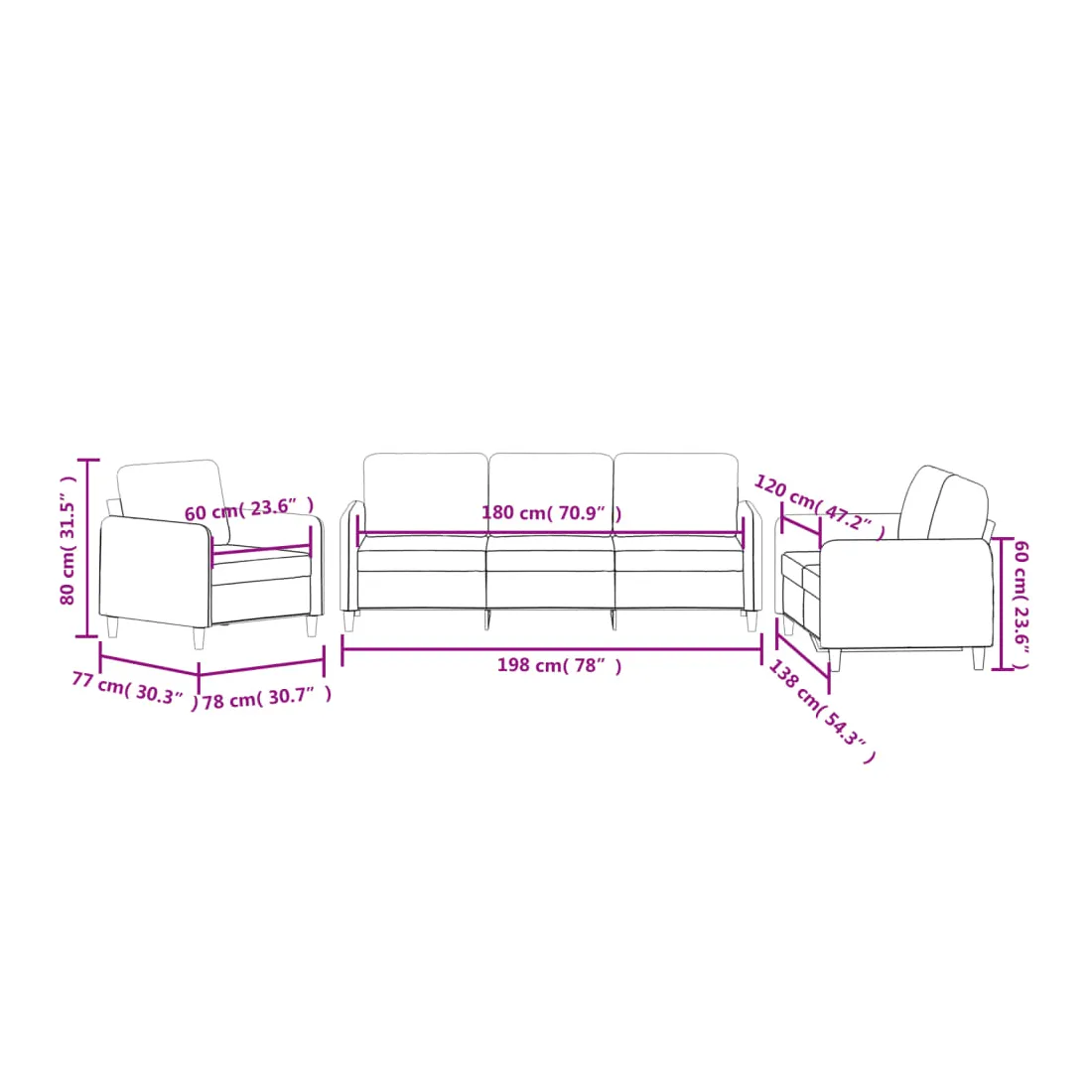 - Dimensions totales : 198 x 77 x 80 cm (l x P x H)