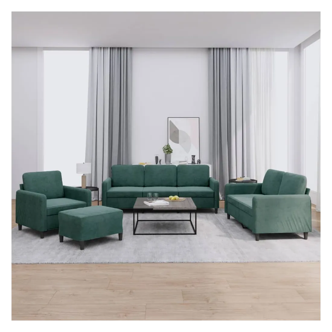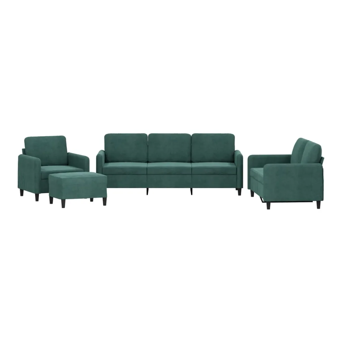 Cet ensemble de canapés est un excellent endroit pour discuter, lire, regarder la télévision ou simplement vous détendre. Il est destiné à être un point central de votre maison. Velours doux : le velours est un tissu doux et confortable, agréable au toucher.Structure robuste et stable : la structure en contreplaqué et en métal du canapé assure robustesse et stabilité.Expérience d'assise confortable : le canapé est très confortable avec le siège, les accoudoirs et les oreillers de dossier bien rembourrés.Pouf polyvalent : ce repose-pied convient pour reposer vos pieds lorsque vous êtes allongé dans un canapé ou pour vous offrir un siège supplémentaire dans votre pièce. De plus, le design simple et la taille compacte le rendent idéal pour presque tous vos espaces de vie.