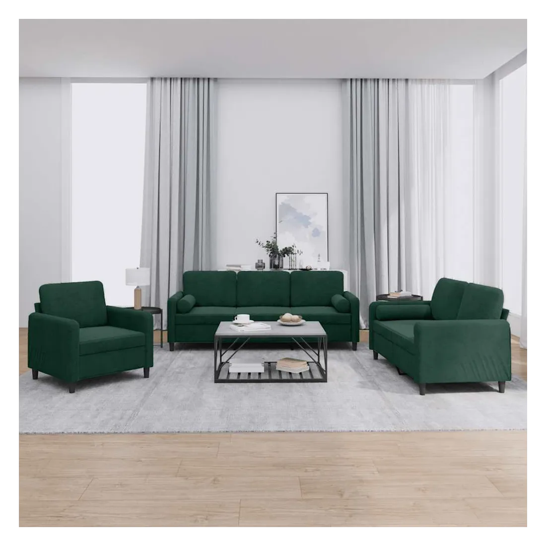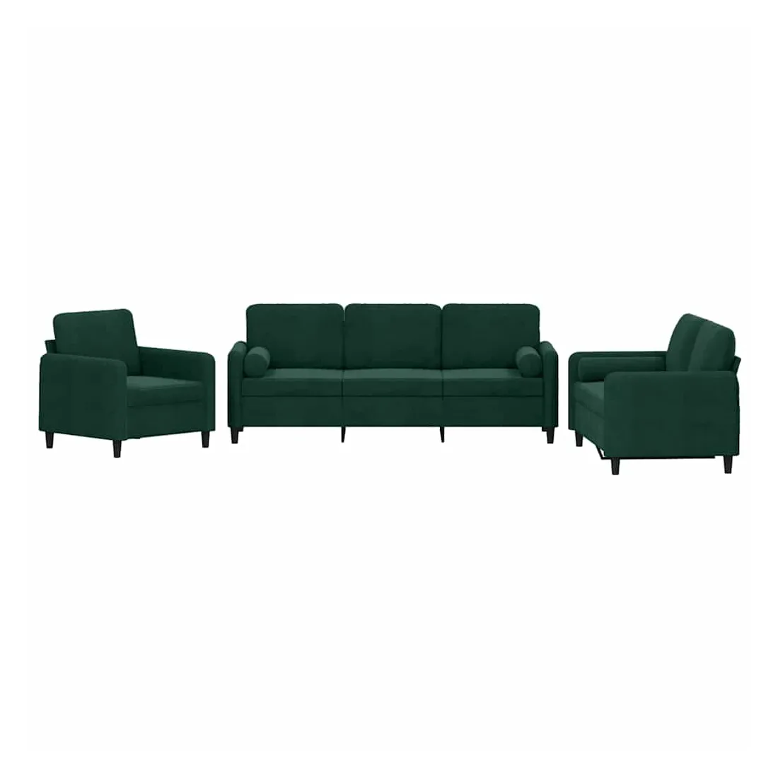 Cet ensemble de canapés est un excellent endroit pour discuter, lire, regarder la télévision ou simplement vous détendre. Il est destiné à être un point central de votre maison. Velours doux : le velours est un tissu doux et confortable, agréable au toucher.Structure robuste et stable : la structure en contreplaqué et en métal du canapé assure robustesse et stabilité.Expérience d'assise confortable : le canapé est très confortable avec le siège, les accoudoirs et les oreillers de dossier bien rembourrés.Oreillers cylindriques pratiques : ces oreillers cylindriques non seulement embellissent votre décor mais ils peuvent également apporter un confort supplémentaire lorsque vous êtes assis ou allongé.