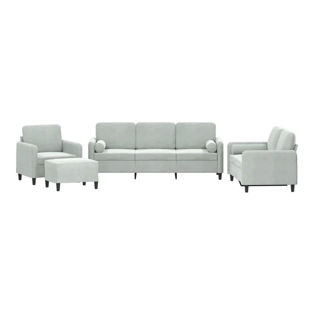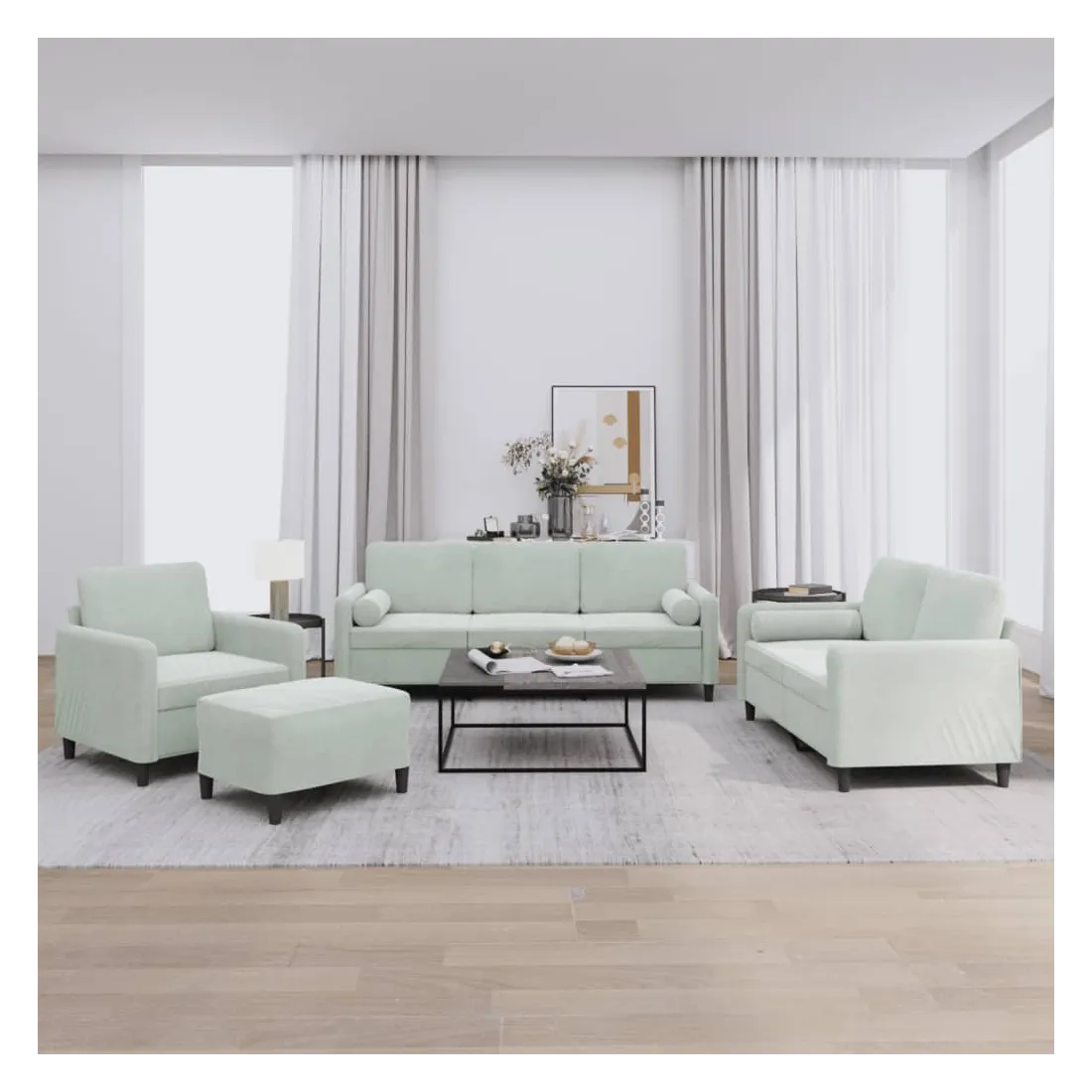 Cet ensemble de canapés est un excellent endroit pour discuter, lire, regarder la télévision ou simplement vous détendre. Il est destiné à être un point central de votre maison. Velours doux : le velours est un tissu doux et confortable, agréable au toucher.Structure robuste et stable : la structure en contreplaqué et en métal du canapé assure robustesse et stabilité.Expérience d'assise confortable : le canapé est très confortable avec le siège, les accoudoirs et les oreillers de dossier bien rembourrés.Oreillers cylindriques pratiques : ces oreillers cylindriques non seulement embellissent votre décor mais ils peuvent également apporter un confort supplémentaire lorsque vous êtes assis ou allongé.Pouf polyvalent : ce repose-pied convient pour reposer vos pieds lorsque vous êtes allongé dans un canapé ou pour vous offrir un siège supplémentaire dans votre pièce. De plus, le design simple et la taille compacte le rendent idéal pour presque tous vos espaces de vie.