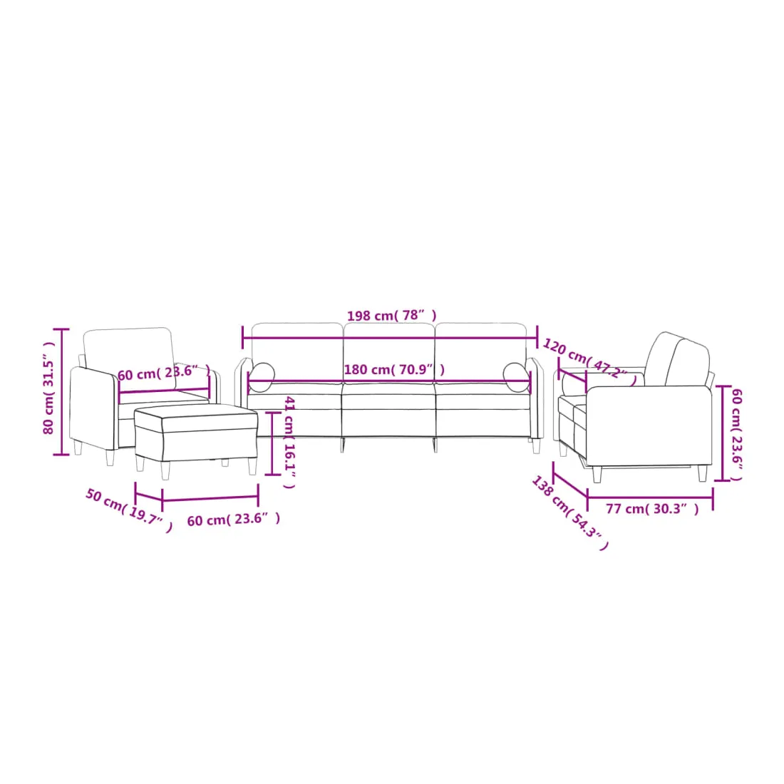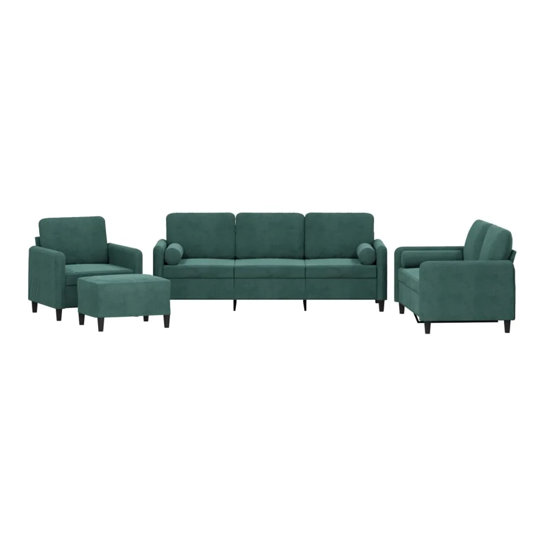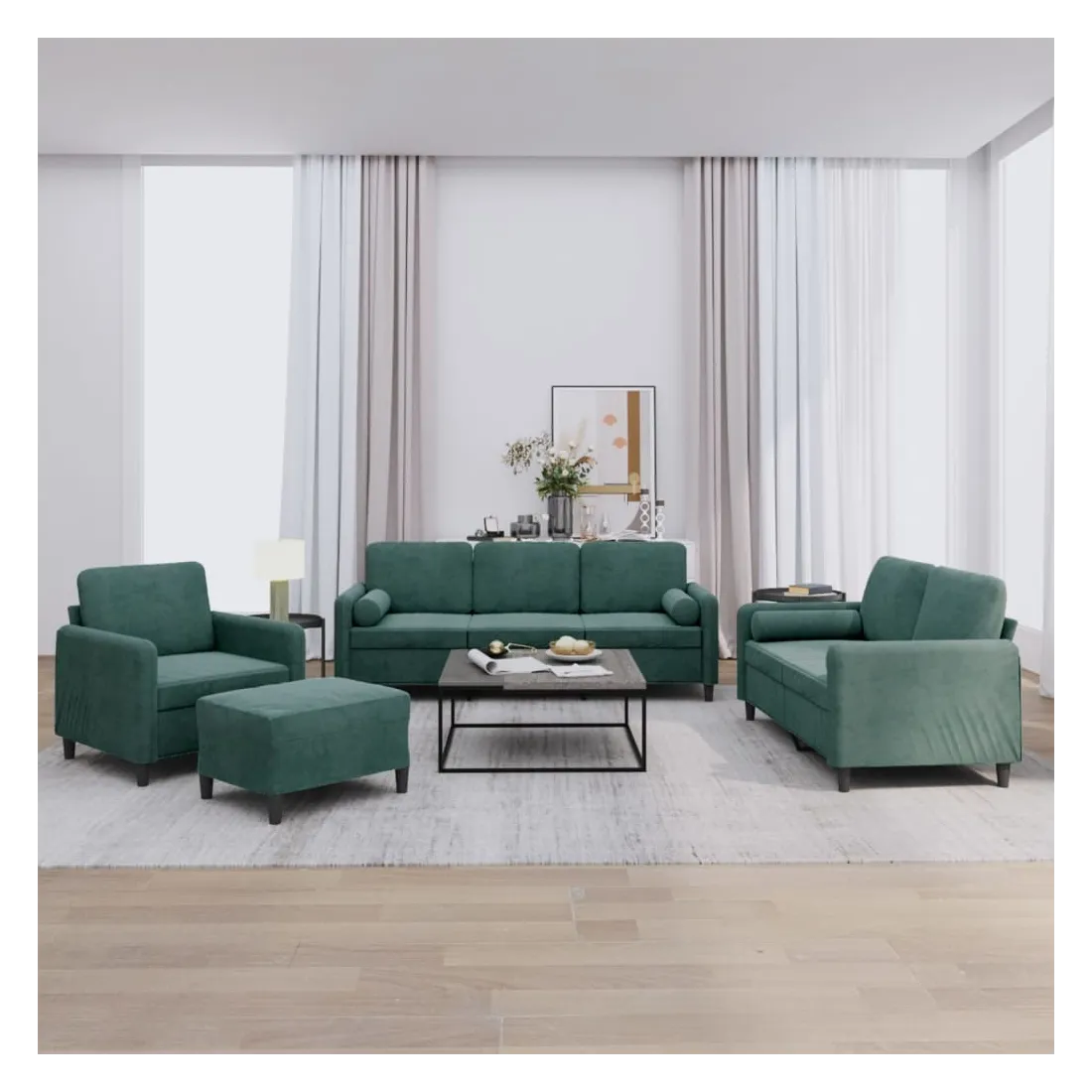Cet ensemble de canapés est un excellent endroit pour discuter, lire, regarder la télévision ou simplement vous détendre. Il est destiné à être un point central de votre maison. Velours doux : le velours est un tissu doux et confortable, agréable au toucher.Structure robuste et stable : la structure en contreplaqué et en métal du canapé assure robustesse et stabilité.Expérience d'assise confortable : le canapé est très confortable avec le siège, les accoudoirs et les oreillers de dossier bien rembourrés.Oreillers cylindriques pratiques : ces oreillers cylindriques non seulement embellissent votre décor mais ils peuvent également apporter un confort supplémentaire lorsque vous êtes assis ou allongé.Pouf polyvalent : ce repose-pied convient pour reposer vos pieds lorsque vous êtes allongé dans un canapé ou pour vous offrir un siège supplémentaire dans votre pièce. De plus, le design simple et la taille compacte le rendent idéal pour presque tous vos espaces de vie.