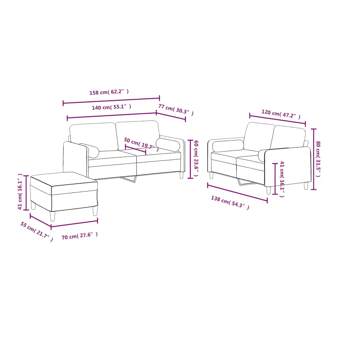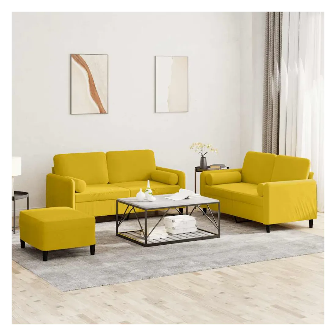 Cet ensemble de canapés est un excellent endroit pour discuter, lire, regarder la télévision ou simplement vous détendre. Il est destiné à être un point central de votre maison. Velours doux : le velours est un tissu doux et confortable, agréable au toucher.Structure robuste et stable : la structure en contreplaqué et en métal du canapé assure robustesse et stabilité.Expérience d'assise confortable : le canapé est très confortable avec le siège, les accoudoirs et les oreillers de dossier bien rembourrés.Oreillers cylindriques pratiques : ces oreillers cylindriques non seulement embellissent votre décor mais ils peuvent également apporter un confort supplémentaire lorsque vous êtes assis ou allongé.Pouf polyvalent : ce repose-pied convient pour reposer vos pieds lorsque vous êtes allongé dans un canapé ou pour vous offrir un siège supplémentaire dans votre pièce. De plus, le design simple et la taille compacte le rendent idéal pour presque tous vos espaces de vie.