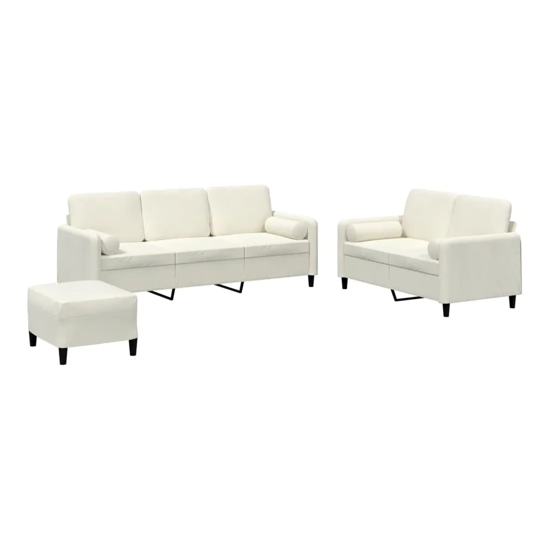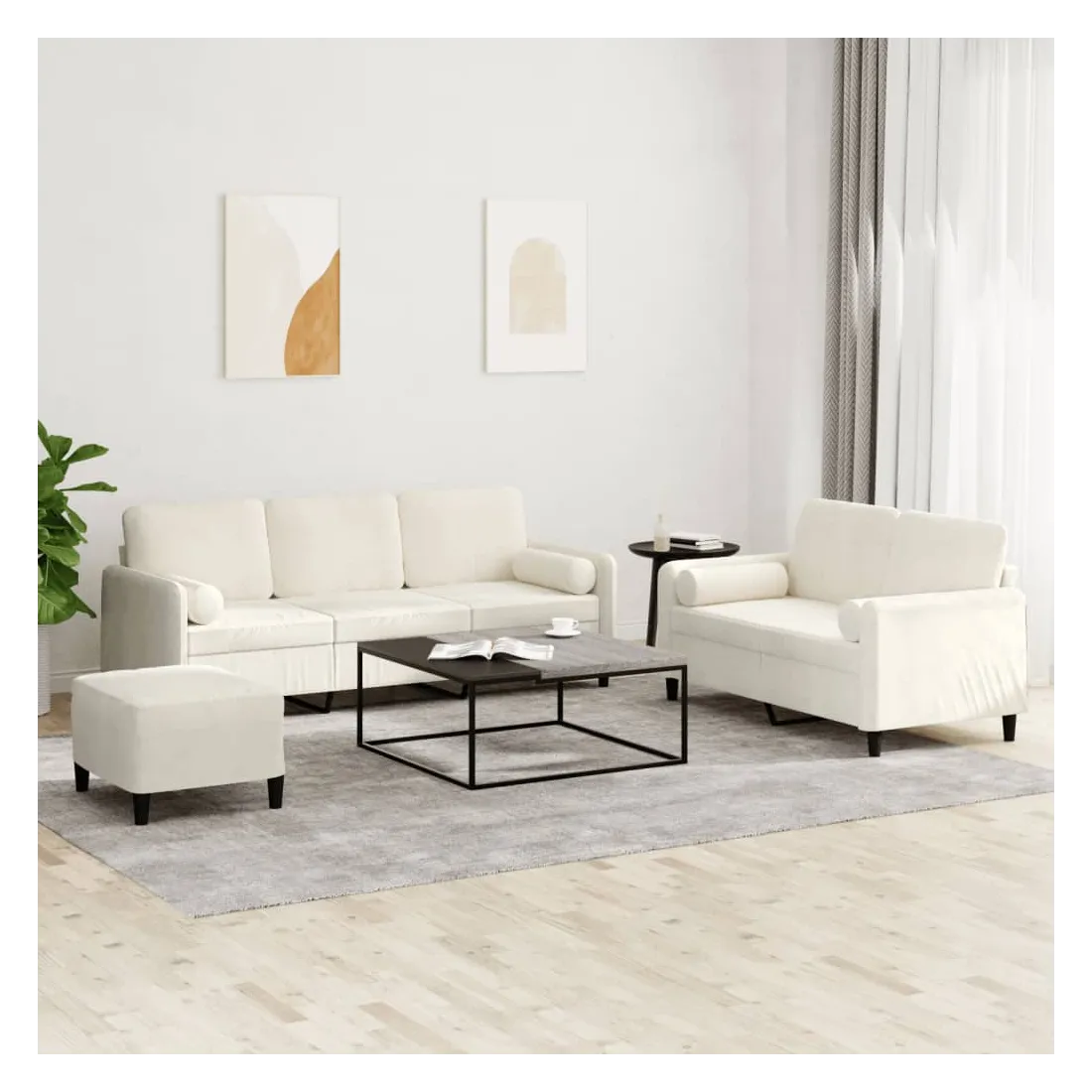 Cet ensemble de canapés est un excellent endroit pour discuter, lire, regarder la télévision ou simplement vous détendre. Il est destiné à être un point central de votre maison. Velours doux : le velours est un tissu doux et confortable, agréable au toucher.Structure robuste et stable : la structure en contreplaqué et en métal du canapé assure robustesse et stabilité.Expérience d'assise confortable : le canapé est très confortable avec le siège, les accoudoirs et les oreillers de dossier bien rembourrés.Oreillers cylindriques pratiques : ces oreillers cylindriques non seulement embellissent votre décor mais ils peuvent également apporter un confort supplémentaire lorsque vous êtes assis ou allongé.Pouf polyvalent : ce repose-pied convient pour reposer vos pieds lorsque vous êtes allongé dans un canapé ou pour vous offrir un siège supplémentaire dans votre pièce. De plus, le design simple et la taille compacte le rendent idéal pour presque tous vos espaces de vie.