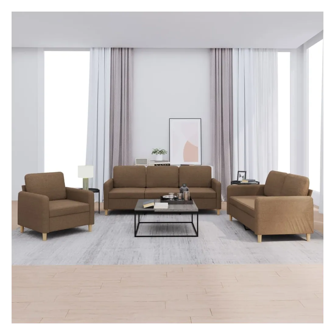 Cet ensemble de canapés est un excellent endroit pour discuter, lire, regarder la télévision ou simplement vous détendre. Il est destiné à être un point central de votre maison. Tissu durable : le tissu présente un aspect simple et épuré tout en restant respirant et durable.Structure robuste et stable : la structure en contreplaqué et en métal du canapé assure robustesse et stabilité.Expérience d'assise confortable : le canapé est très confortable avec le siège, les accoudoirs et les coussins de dossier bien rembourrés.