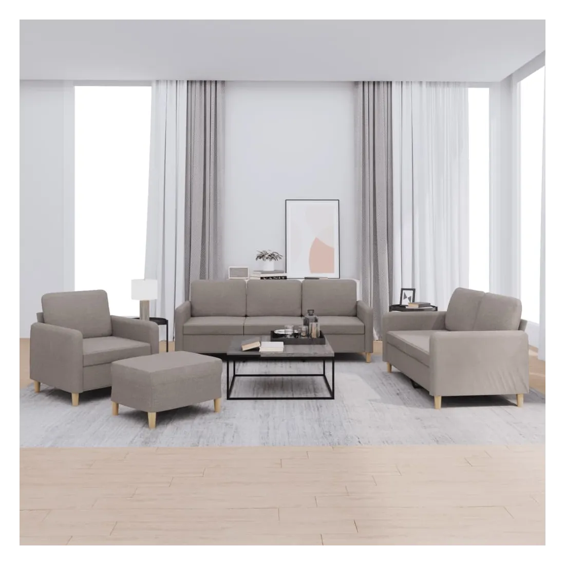 Cet ensemble de canapés est un excellent endroit pour discuter, lire, regarder la télévision ou simplement vous détendre. Il est destiné à être un point central de votre maison. Tissu durable : le tissu présente un aspect simple et épuré tout en restant respirant et durable.Structure robuste et stable : la structure en contreplaqué et en métal du canapé assure robustesse et stabilité.Expérience d'assise confortable : le canapé est très confortable avec le siège, les accoudoirs et les coussins de dossier bien rembourrés.Pouf polyvalent : ce repose-pied convient pour reposer vos pieds lorsque vous êtes allongé dans un canapé ou pour vous offrir un siège supplémentaire dans votre pièce. De plus, le design simple et la taille compacte le rendent idéal pour presque tous vos espaces de vie.
