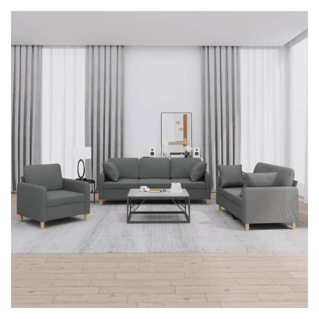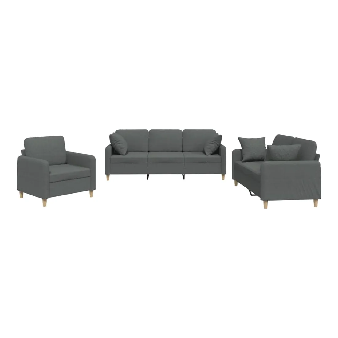 Cet ensemble de canapés est un excellent endroit pour discuter, lire, regarder la télévision ou simplement vous détendre. Il est destiné à être un point central de votre maison. Tissu durable : le tissu présente un aspect simple et épuré tout en restant respirant et durable.Structure robuste et stable : la structure en contreplaqué et en métal du canapé assure robustesse et stabilité.Expérience d'assise confortable : le canapé est très confortable avec le siège, les accoudoirs et les coussins de dossier bien rembourrés.Oreillers de canapé pratiques : ces oreillers décoratifs carrés non seulement embellissent votre décor mais ils peuvent également apporter un confort supplémentaire lorsque vous êtes assis ou allongé.