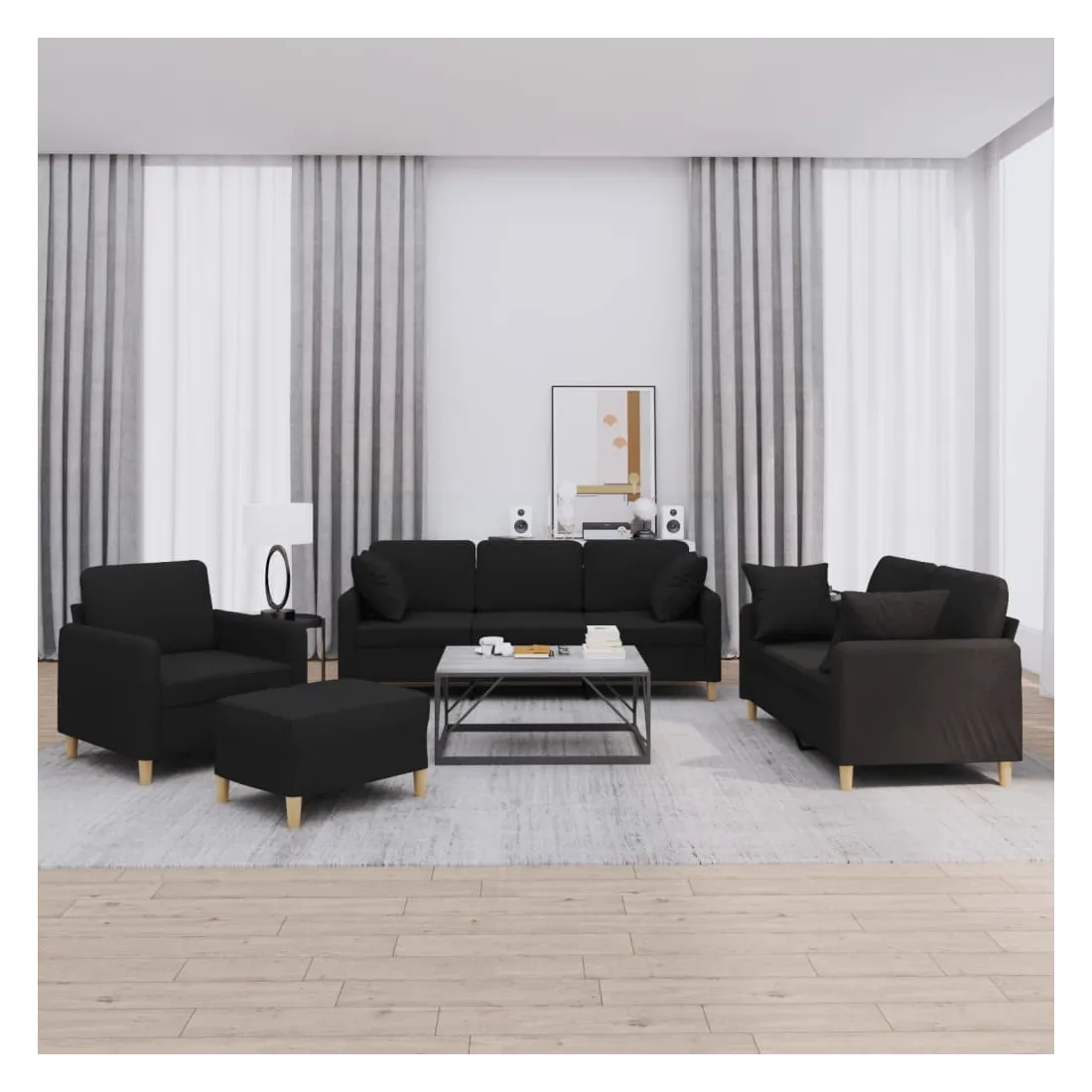Cet ensemble de canapés est un excellent endroit pour discuter, lire, regarder la télévision ou simplement vous détendre. Il est destiné à être un point central de votre maison. Tissu durable : le tissu présente un aspect simple et épuré tout en restant respirant et durable.Structure robuste et stable : la structure en contreplaqué et en métal du canapé assure robustesse et stabilité.Expérience d'assise confortable : le canapé est très confortable avec le siège, les accoudoirs et les coussins de dossier bien rembourrés.Oreillers de canapé pratiques : ces oreillers décoratifs carrés non seulement embellissent votre décor mais ils peuvent également apporter un confort supplémentaire lorsque vous êtes assis ou allongé.Pouf polyvalent : ce repose-pied convient pour reposer vos pieds lorsque vous êtes allongé dans un canapé ou pour vous offrir un siège supplémentaire dans votre pièce. De plus, le design simple et la taille compacte le rendent idéal pour presque tous vos espaces de vie.