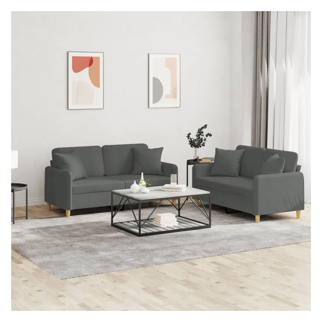 Cet ensemble de canapés est un excellent endroit pour discuter, lire, regarder la télévision ou simplement vous détendre. Il est destiné à être un point central de votre maison. Tissu durable : le tissu présente un aspect simple et épuré tout en restant respirant et durable.Structure robuste et stable : la structure en contreplaqué et en métal du canapé assure robustesse et stabilité.Expérience d'assise confortable : le canapé est très confortable avec le siège, les accoudoirs et les coussins de dossier bien rembourrés.Oreillers de canapé pratiques : ces oreillers décoratifs carrés non seulement embellissent votre décor mais ils peuvent également apporter un confort supplémentaire lorsque vous êtes assis ou allongé.