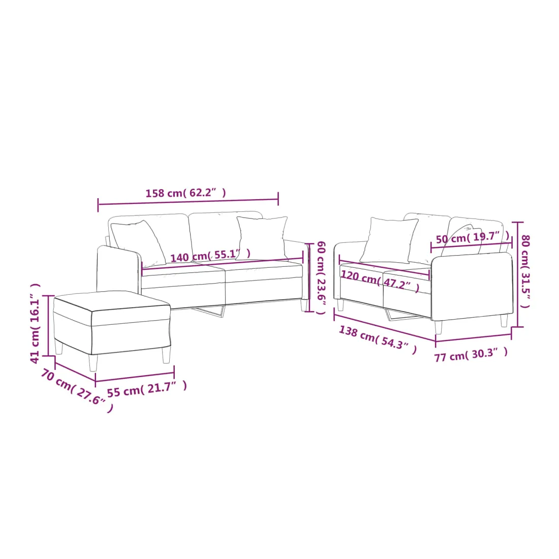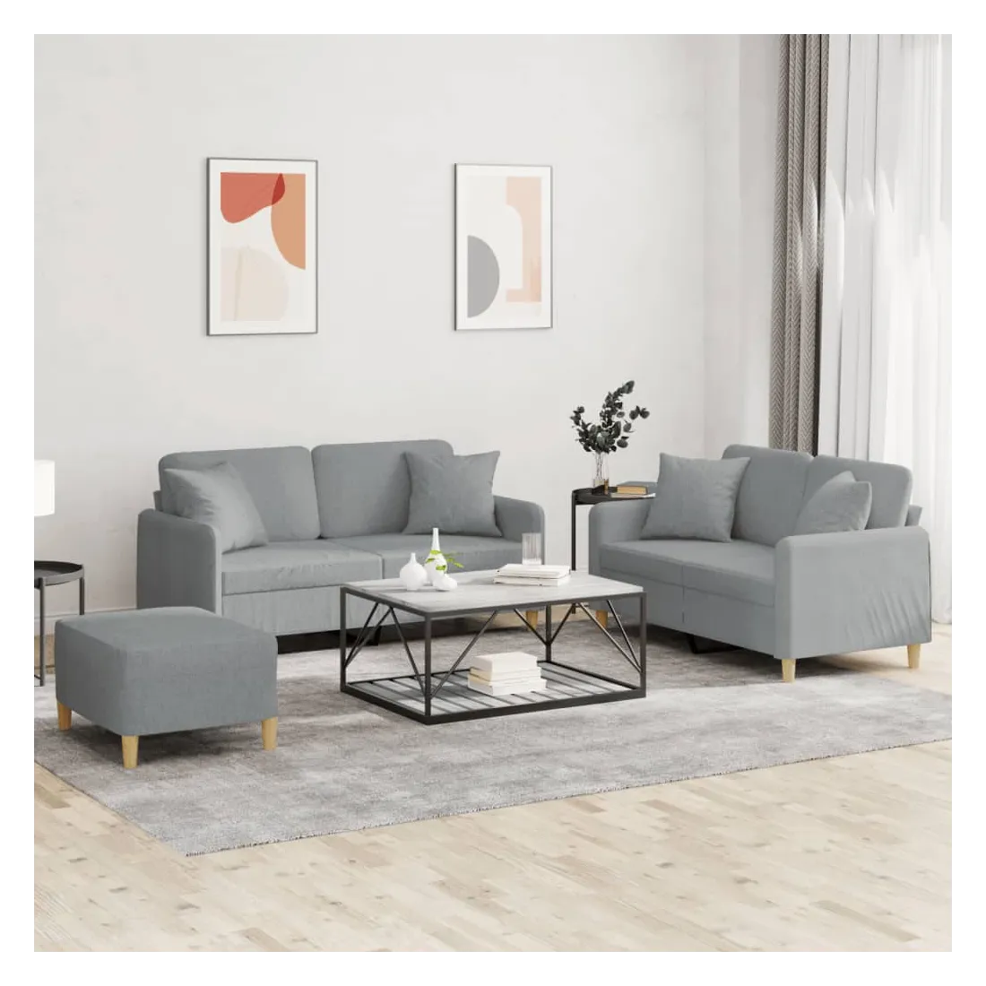 Cet ensemble de canapés est un excellent endroit pour discuter, lire, regarder la télévision ou simplement vous détendre. Il est destiné à être un point central de votre maison. Tissu durable : le tissu présente un aspect simple et épuré tout en restant respirant et durable.Structure robuste et stable : la structure en contreplaqué et en métal du canapé assure robustesse et stabilité.Expérience d'assise confortable : le canapé est très confortable avec le siège, les accoudoirs et les coussins de dossier bien rembourrés.Oreillers de canapé pratiques : ces oreillers décoratifs carrés non seulement embellissent votre décor mais ils peuvent également apporter un confort supplémentaire lorsque vous êtes assis ou allongé.Pouf polyvalent : ce repose-pied convient pour reposer vos pieds lorsque vous êtes allongé dans un canapé ou pour vous offrir un siège supplémentaire dans votre pièce. De plus, le design simple et la taille compacte le rendent idéal pour presque tous vos espaces de vie.