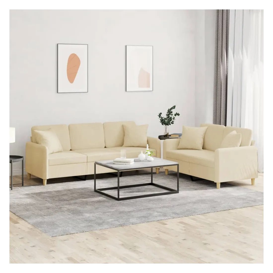 Cet ensemble de canapés est un excellent endroit pour discuter, lire, regarder la télévision ou simplement vous détendre. Il est destiné à être un point central de votre maison. Tissu durable : le tissu présente un aspect simple et épuré tout en restant respirant et durable.Structure robuste et stable : la structure en contreplaqué et en métal du canapé assure robustesse et stabilité.Expérience d'assise confortable : le canapé est très confortable avec le siège, les accoudoirs et les coussins de dossier bien rembourrés.Oreillers de canapé pratiques : ces oreillers décoratifs carrés non seulement embellissent votre décor mais ils peuvent également apporter un confort supplémentaire lorsque vous êtes assis ou allongé.