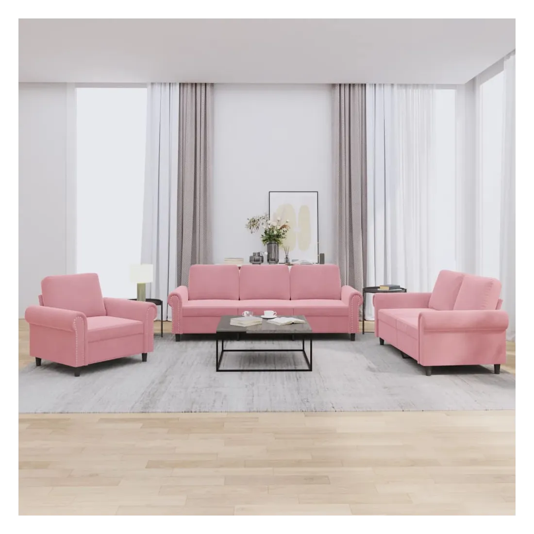 Cet ensemble de canapés est un excellent endroit pour discuter, lire, regarder la télévision ou simplement vous détendre. Il est destiné à être un point central de votre maison. Velours doux : le velours est un tissu doux et confortable, agréable au toucher.Structure robuste et stable : la structure en contreplaqué et en métal du canapé assure robustesse et stabilité.Expérience d'assise confortable : le canapé est très confortable avec le siège, les accoudoirs et les oreillers de dossier bien rembourrés.