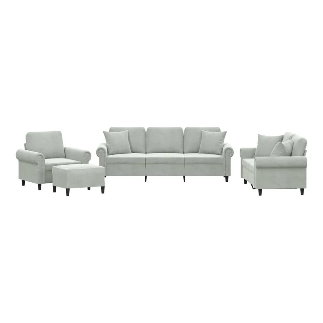 Cet ensemble de canapés est un excellent endroit pour discuter, lire, regarder la télévision ou simplement vous détendre. Il est destiné à être un point central de votre maison. Velours doux : le velours est un tissu doux et confortable, agréable au toucher.Structure robuste et stable : la structure en contreplaqué et en métal du canapé assure robustesse et stabilité.Expérience d'assise confortable : le canapé est très confortable avec le siège, les accoudoirs et les oreillers de dossier bien rembourrés.Oreillers de canapé pratiques : ces oreillers décoratifs carrés non seulement embellissent votre décor mais ils peuvent également apporter un confort supplémentaire lorsque vous êtes assis ou allongé.Pouf polyvalent : ce repose-pied convient pour reposer vos pieds lorsque vous êtes allongé dans un canapé ou pour vous offrir un siège supplémentaire dans votre pièce. De plus, le design simple et la taille compacte le rendent idéal pour presque tous vos espaces de vie.