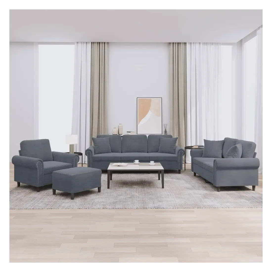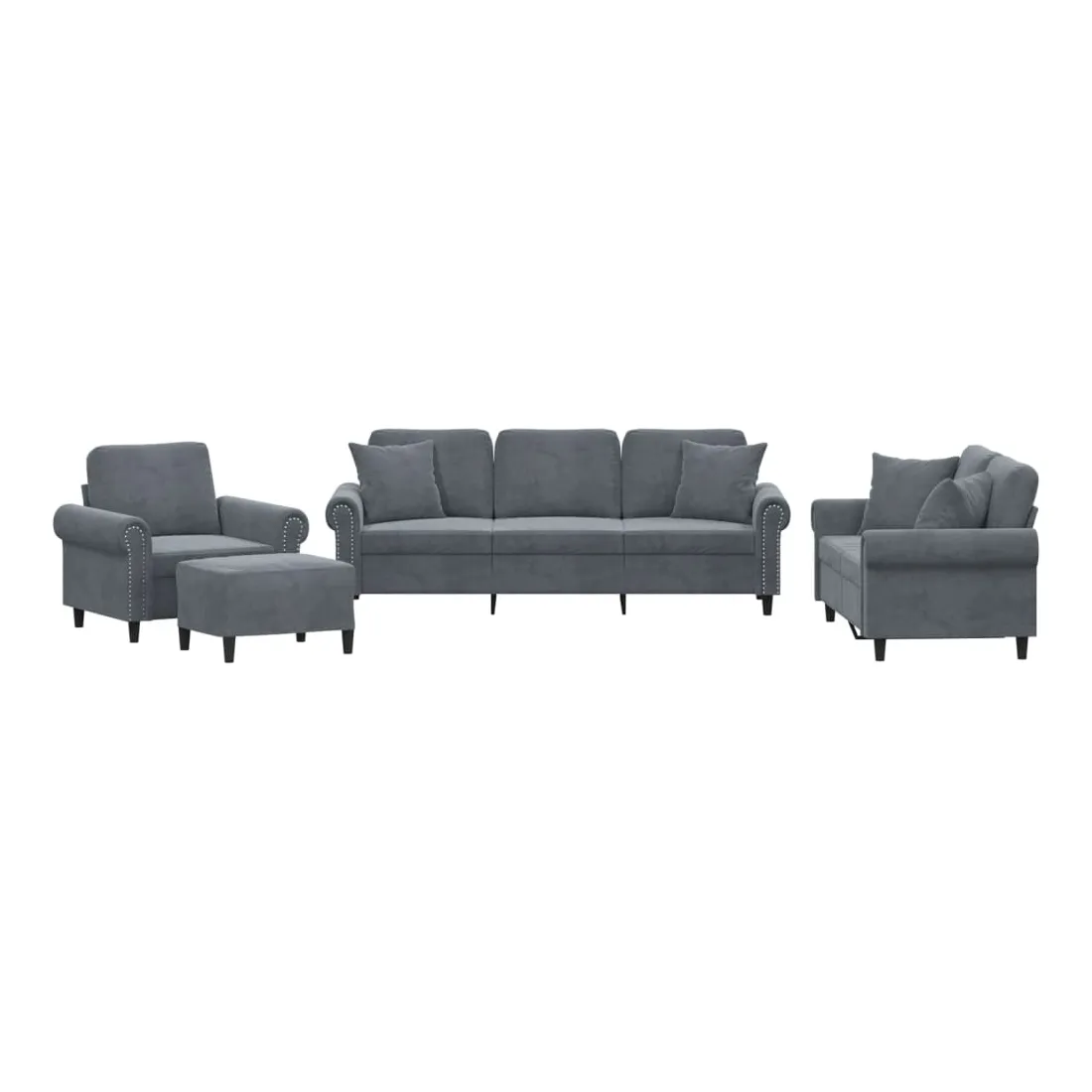 Cet ensemble de canapés est un excellent endroit pour discuter, lire, regarder la télévision ou simplement vous détendre. Il est destiné à être un point central de votre maison. Velours doux : le velours est un tissu doux et confortable, agréable au toucher.Structure robuste et stable : la structure en contreplaqué et en métal du canapé assure robustesse et stabilité.Expérience d'assise confortable : le canapé est très confortable avec le siège, les accoudoirs et les oreillers de dossier bien rembourrés.Oreillers de canapé pratiques : ces oreillers décoratifs carrés non seulement embellissent votre décor mais ils peuvent également apporter un confort supplémentaire lorsque vous êtes assis ou allongé.Pouf polyvalent : ce repose-pied convient pour reposer vos pieds lorsque vous êtes allongé dans un canapé ou pour vous offrir un siège supplémentaire dans votre pièce. De plus, le design simple et la taille compacte le rendent idéal pour presque tous vos espaces de vie.