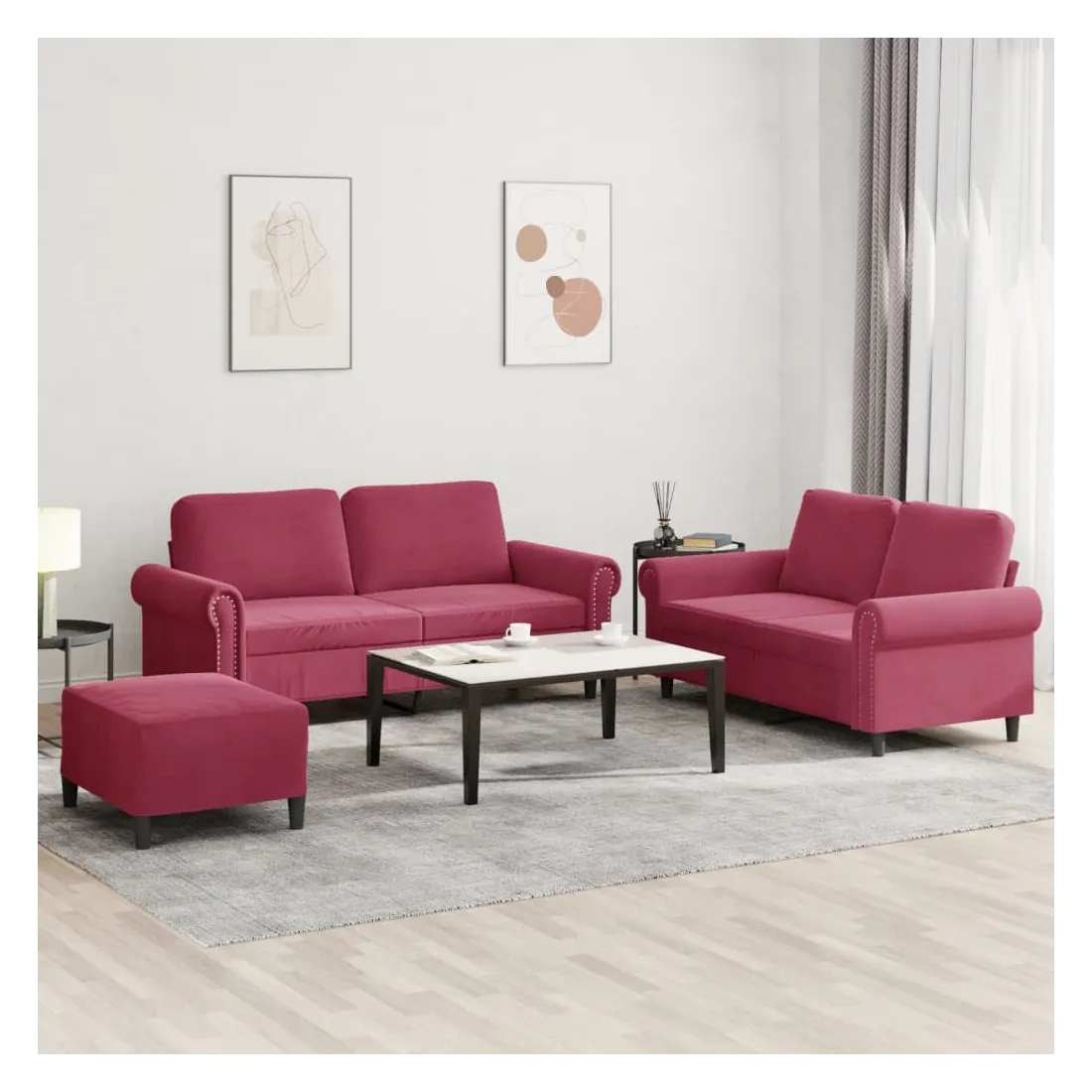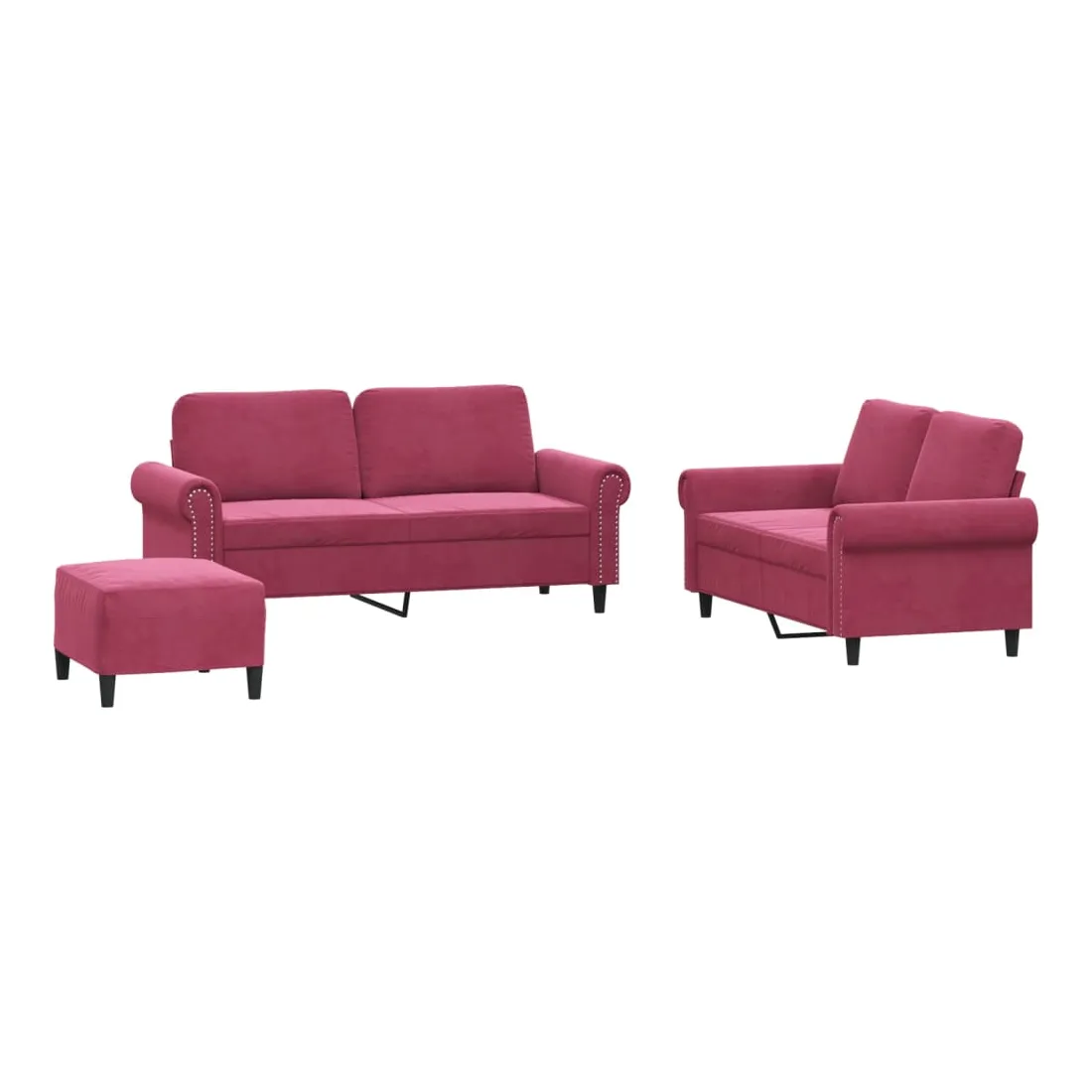 Cet ensemble de canapés est un excellent endroit pour discuter, lire, regarder la télévision ou simplement vous détendre. Il est destiné à être un point central de votre maison. Velours doux : le velours est un tissu doux et confortable, agréable au toucher.Structure robuste et stable : la structure en contreplaqué et en métal du canapé assure robustesse et stabilité.Expérience d'assise confortable : le canapé est très confortable avec le siège, les accoudoirs et les oreillers de dossier bien rembourrés.Pouf polyvalent : ce repose-pied convient pour reposer vos pieds lorsque vous êtes allongé dans un canapé, ou pour vous offrir un siège supplémentaire dans votre pièce. De plus, le design simple et la taille compacte le rendent idéal pour presque tous vos espaces de vie.
