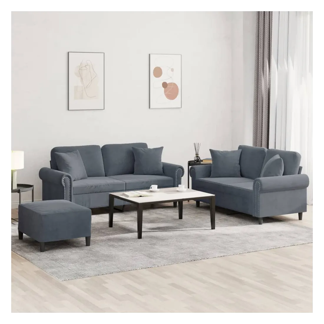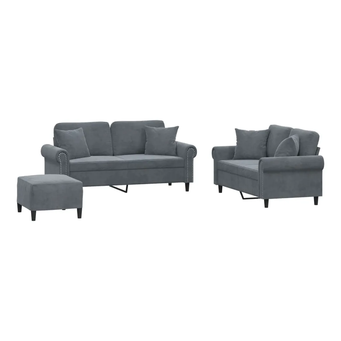 Cet ensemble de canapés est un excellent endroit pour discuter, lire, regarder la télévision ou simplement vous détendre. Il est destiné à être un point central de votre maison. Velours doux : le velours est un tissu doux et confortable, agréable au toucher.Structure robuste et stable : la structure en contreplaqué et en métal du canapé assure robustesse et stabilité.Expérience d'assise confortable : le canapé est très confortable avec le siège, les accoudoirs et les oreillers de dossier bien rembourrés.Oreillers de canapé pratiques : ces oreillers décoratifs carrés non seulement embellissent votre décor mais ils peuvent également apporter un confort supplémentaire lorsque vous êtes assis ou allongé.Pouf polyvalent : ce repose-pied convient pour reposer vos pieds lorsque vous êtes allongé dans un canapé, ou pour vous offrir un siège supplémentaire dans votre pièce. De plus, le design simple et la taille compacte le rendent idéal pour presque tous vos espaces de vie.