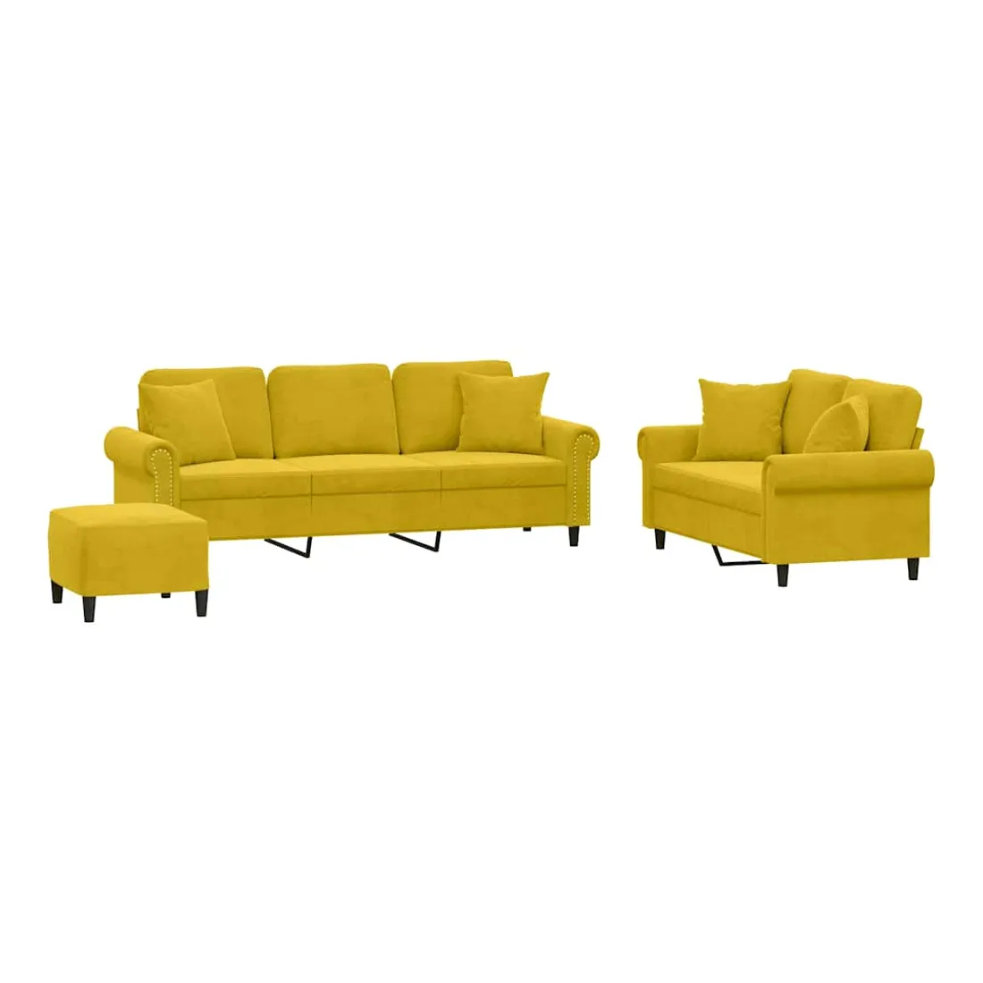 Cet ensemble de canapés est un excellent endroit pour discuter, lire, regarder la télévision ou simplement vous détendre. Il est destiné à être un point central de votre maison. Velours doux : le velours est un tissu doux et confortable, agréable au toucher.Structure robuste et stable : la structure en contreplaqué et en métal du canapé assure robustesse et stabilité.Expérience d'assise confortable : le canapé est très confortable avec le siège, les accoudoirs et les oreillers de dossier bien rembourrés.Oreillers de canapé pratiques : ces oreillers décoratifs carrés non seulement embellissent votre décor mais ils peuvent également apporter un confort supplémentaire lorsque vous êtes assis ou allongé.Pouf polyvalent : ce repose-pied convient pour reposer vos pieds lorsque vous êtes allongé dans un canapé, ou pour vous offrir un siège supplémentaire dans votre pièce. De plus, le design simple et la taille compacte le rendent idéal pour presque tous vos espaces de vie.