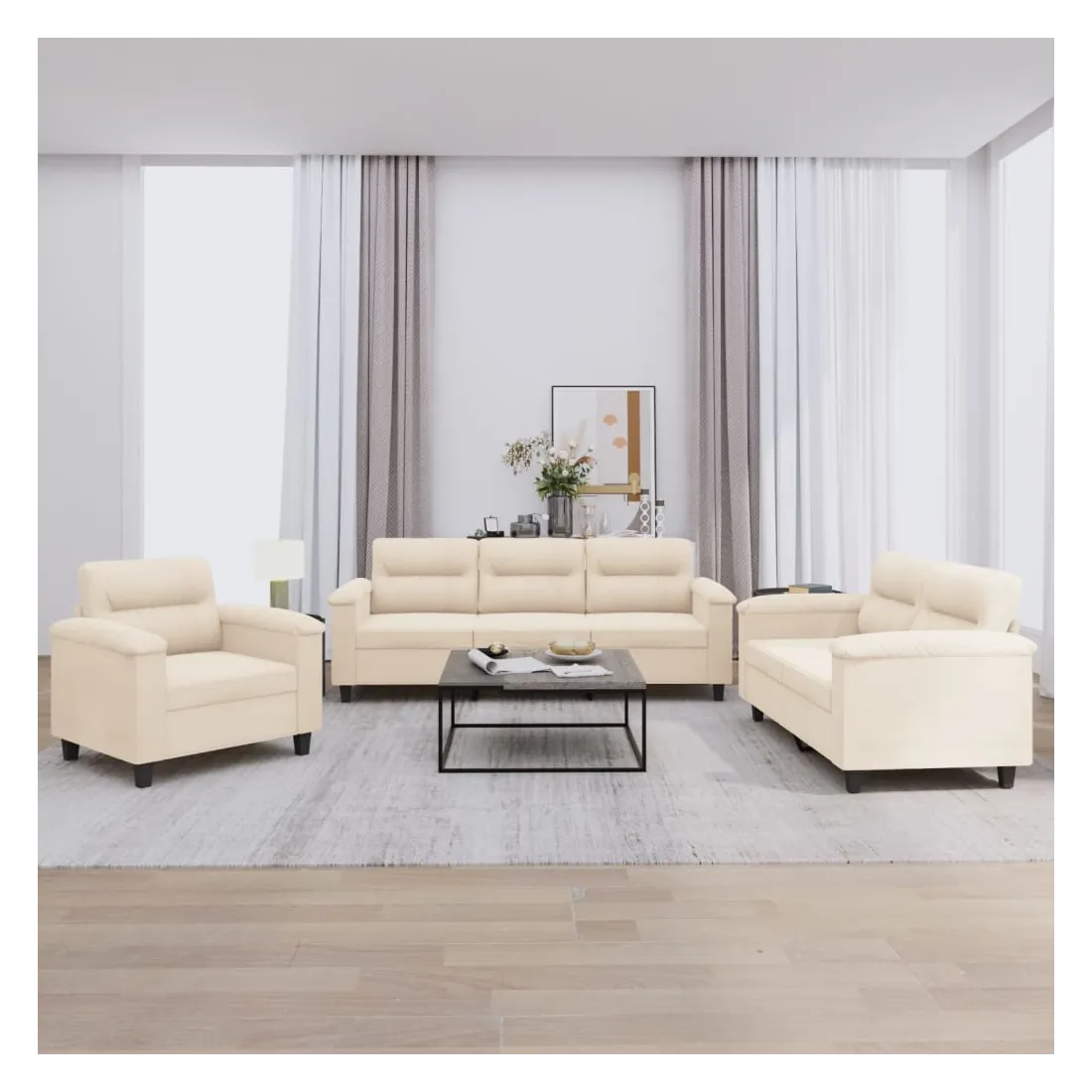 Cet ensemble de canapés est un excellent endroit pour discuter, lire, regarder la télévision ou simplement vous détendre. Il est destiné à être un point central de votre maison. Microfibre résistant : le microfibre est un tissu synthétique composé de fibres ultra-fines, particulièrement résistantes aux taches. Le tissu en microfibre est un excellent choix pour le rembourrage des meubles en raison de sa durabilité et de son nettoyage facile.Structure robuste et stable : la structure en contreplaqué et en métal du canapé assure robustesse et stabilité.Expérience d'assise confortable : le canapé est très confortable avec le siège, les accoudoirs et les oreillers de dossier bien rembourrés.