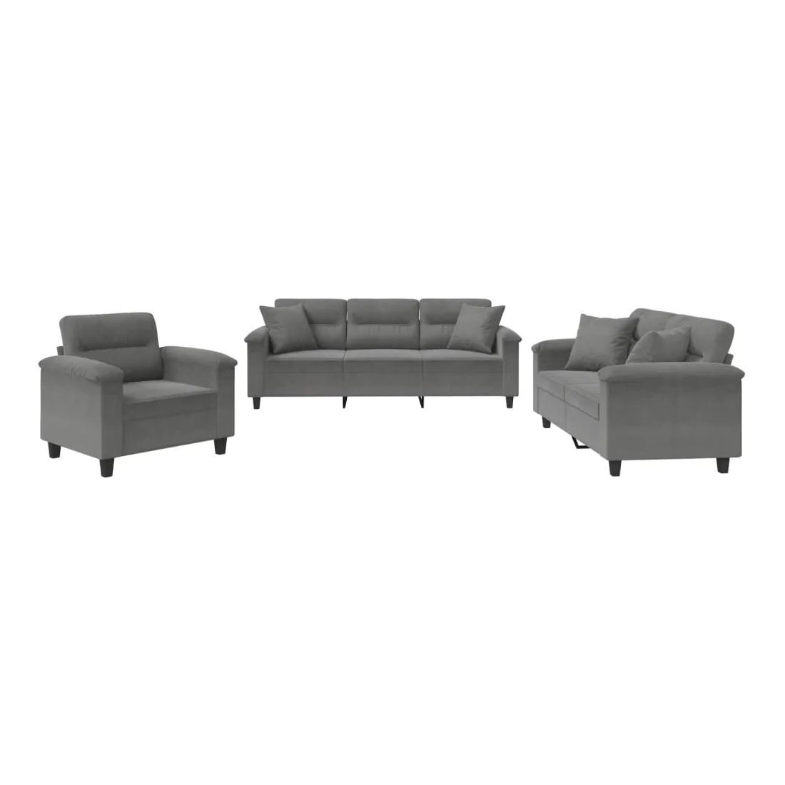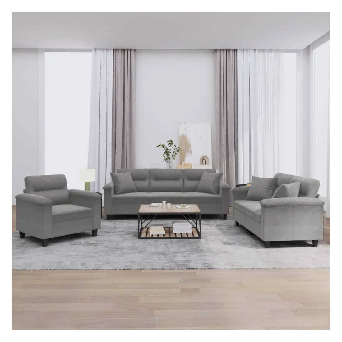 Cet ensemble de canapés est un excellent endroit pour discuter, lire, regarder la télévision ou simplement vous détendre. Il est destiné à être un point central de votre maison. Microfibre résistant : le microfibre est un tissu synthétique composé de fibres ultra-fines, particulièrement résistantes aux taches. Le tissu en microfibre est un excellent choix pour le rembourrage des meubles en raison de sa durabilité et de son nettoyage facile.Structure robuste et stable : la structure en contreplaqué et en métal du canapé assure robustesse et stabilité.Expérience d'assise confortable : le canapé est très confortable avec le siège, les accoudoirs et les oreillers de dossier bien rembourrés.Oreillers de canapé pratiques : ces oreillers décoratifs carrés non seulement embellissent votre décor mais ils peuvent également apporter un confort supplémentaire lorsque vous êtes assis ou allongé.