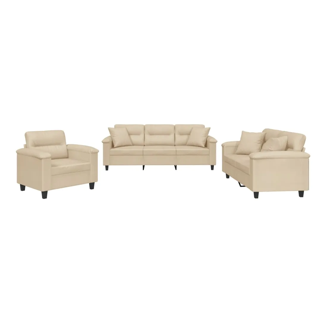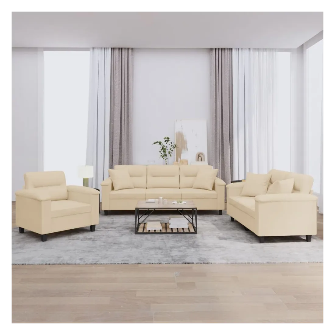 Cet ensemble de canapés est un excellent endroit pour discuter, lire, regarder la télévision ou simplement vous détendre. Il est destiné à être un point central de votre maison. Microfibre résistant : le microfibre est un tissu synthétique composé de fibres ultra-fines, particulièrement résistantes aux taches. Le tissu en microfibre est un excellent choix pour le rembourrage des meubles en raison de sa durabilité et de son nettoyage facile.Structure robuste et stable : la structure en contreplaqué et en métal du canapé assure robustesse et stabilité.Expérience d'assise confortable : le canapé est très confortable avec le siège, les accoudoirs et les oreillers de dossier bien rembourrés.Oreillers de canapé pratiques : ces oreillers décoratifs carrés non seulement embellissent votre décor mais ils peuvent également apporter un confort supplémentaire lorsque vous êtes assis ou allongé.