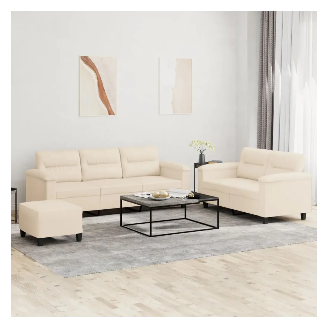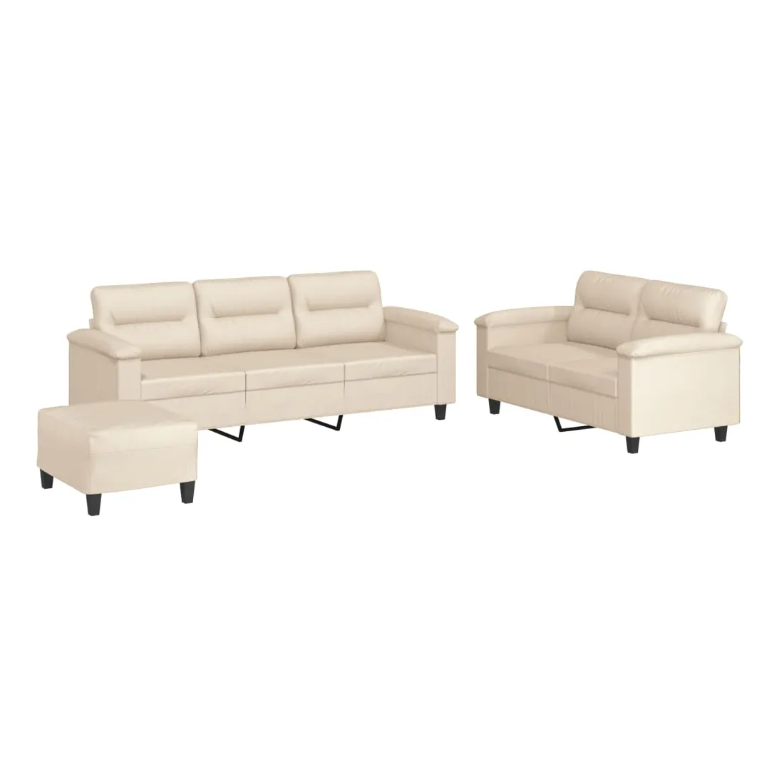 Cet ensemble de canapés est un excellent endroit pour discuter, lire, regarder la télévision ou simplement vous détendre. Il est destiné à être un point central de votre maison. Microfibre résistant : le microfibre est un tissu synthétique composé de fibres ultra-fines, particulièrement résistantes aux taches. Le tissu en microfibre est un excellent choix pour le rembourrage des meubles en raison de sa durabilité et de son nettoyage facile.Structure robuste et stable : la structure en contreplaqué et en métal du canapé assure robustesse et stabilité.Expérience d'assise confortable : le canapé est très confortable avec le siège, les accoudoirs et les oreillers de dossier bien rembourrés.Pouf polyvalent : ce repose-pied convient pour reposer vos pieds lorsque vous êtes allongé dans un canapé, ou pour vous offrir un siège supplémentaire dans votre pièce. De plus, le design simple et la taille compacte le rendent idéal pour presque tous vos espaces de vie.