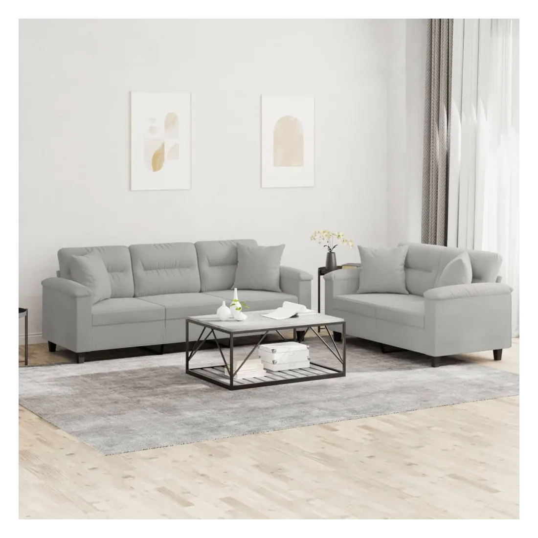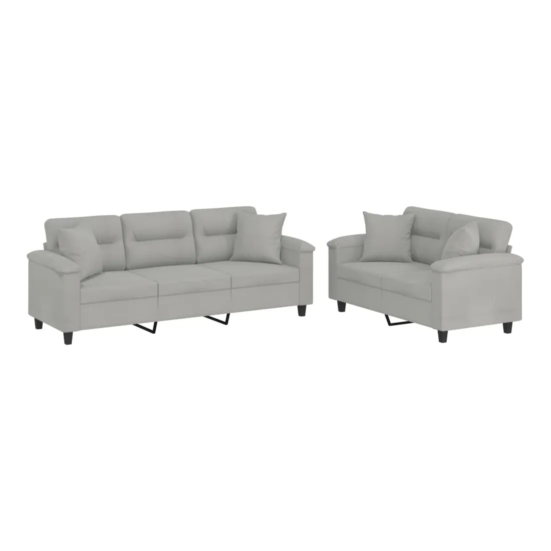 Cet ensemble de canapés est un excellent endroit pour discuter, lire, regarder la télévision ou simplement vous détendre. Il est destiné à être un point central de votre maison. Microfibre résistant : le microfibre est un tissu synthétique composé de fibres ultra-fines, particulièrement résistantes aux taches. Le tissu en microfibre est un excellent choix pour le rembourrage des meubles en raison de sa durabilité et de son nettoyage facile.Structure robuste et stable : la structure en contreplaqué et en métal du canapé assure robustesse et stabilité.Expérience d'assise confortable : le canapé est très confortable avec le siège, les accoudoirs et les oreillers de dossier bien rembourrés.Oreillers de canapé pratiques : ces oreillers décoratifs carrés non seulement embellissent votre décor mais ils peuvent également apporter un confort supplémentaire lorsque vous êtes assis ou allongé.