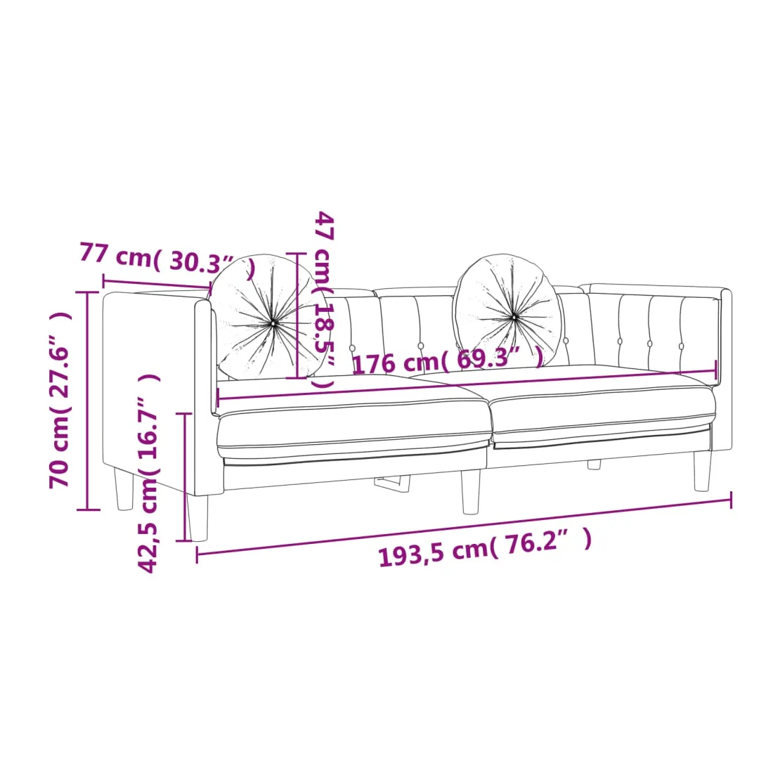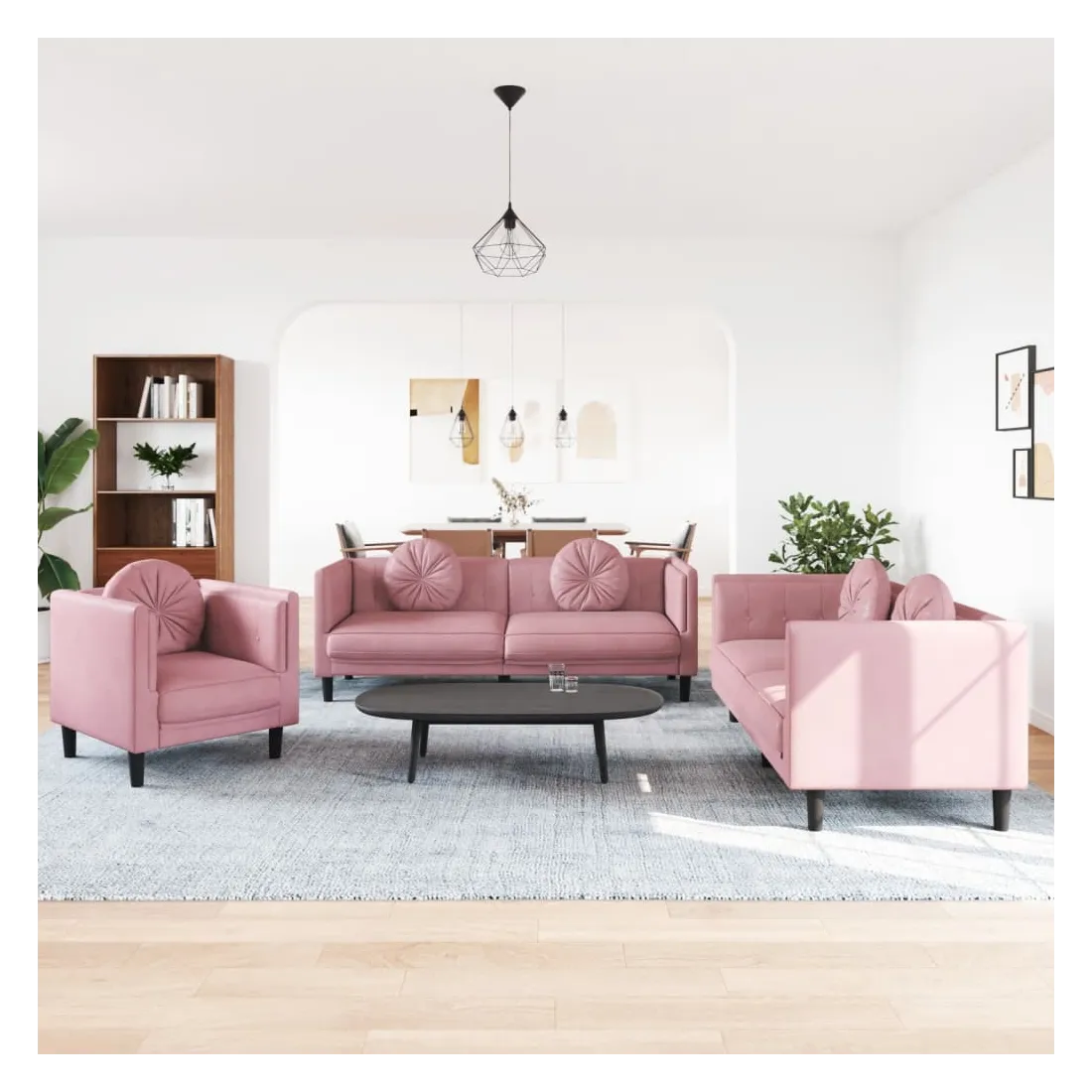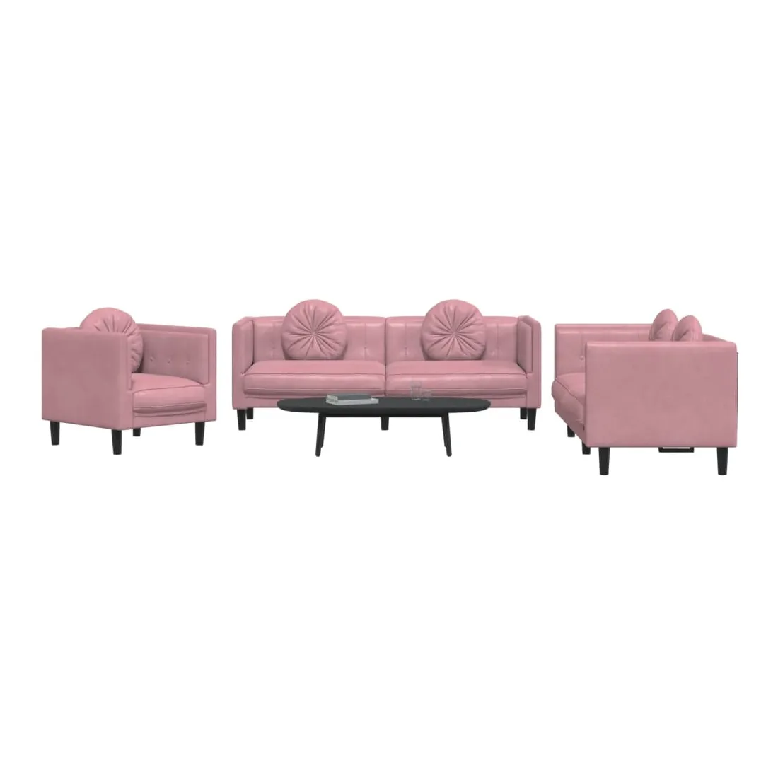 Cet ensemble de canapés est un excellent endroit pour discuter, lire, regarder la télévision ou simplement vous détendre. Il est destiné à être un point central de votre maison. Velours doux : le velours est un tissu doux et confortable, agréable au toucher.Expérience d'assise confortable : le canapé est très confortable grâce au siège et aux accoudoirs épais et rembourrés.Oreillers ronds pratiques : ces oreillers décoratifs ronds non seulement embellissent votre décor mais ils peuvent également apporter un confort supplémentaire lorsque vous êtes assis ou allongé.Pieds de soutien : le canapé rembourré est soutenu par des pieds robustes, qui assurent sa stabilité, sa sécurité et sa fermeté.Design accrocheur : doté d'un design simple mais moderne, ce siège de salon est destiné à attirer l'attention dans votre pièce.