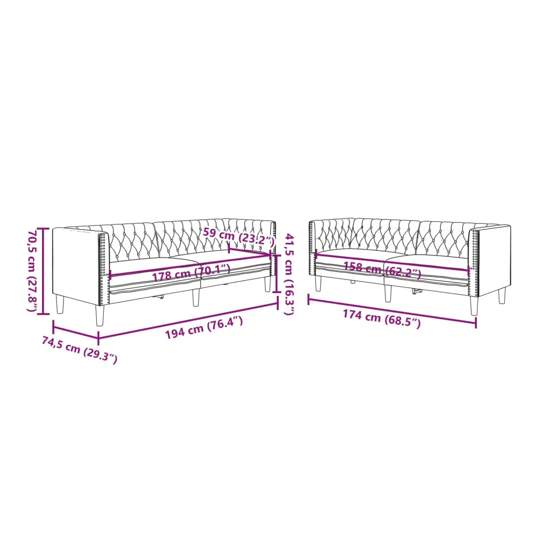 vidaXLCet ensemble de canapé Chesterfield est un excellent endroit pour discuter, lire, regarder la télévision ou simplement se détendre. Il est destiné à être un point central dans votre maison. Longue durée de vie et entretien facile : le similicuir est un matériau très durable qui résiste aux taches, ce qui le rend facile à nettoyer avec un chiffon humide. Sa surface lisse lui confère un aspect élégant qui ressemble à celui du cuir véritable.Expérience d'assise confortable : le canapé est très confortable avec les sièges, les accoudoirs et les oreillers de dossier bien rembourrés.Style Chesterfield : avec le dossier et les accoudoirs classiques à boutons tuftés, et une hauteur de dossier et d'accoudoir uniforme, le canapé rehaussera n'importe quelle pièce, offrant à la fois style et confort.Pieds de soutien : le canapé rembourré est soutenu par des pieds robustes, qui assurent sa stabilité, sa sécurité et sa fermeté.