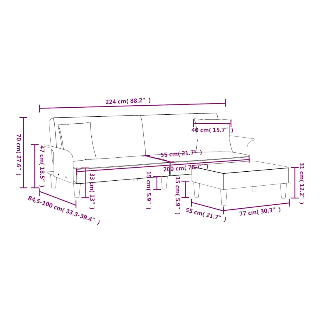 vidaXLCe canapé-lit avec repose-pied est une solution parfaite pour accueillir des invités pour la nuit tout en offrant un espace confortable pour s'asseoir pendant la journée. Matériau durable : le velours est un tissu doux et confortable, agréable au toucher.Dossier réglable : vous pouvez pousser les deux coussins de dossier séparés partiellement ou complètement vers le bas pour créer un endroit idéal pour une sieste ou un lit double.Cadre robuste et stable : le cadre en bois du canapé-lit assure robustesse et stabilité.Confort supplémentaire : ce repose-pied est adapté pour y mettre vos pieds en fin de journée ou pour vous offrir un siège supplémentaire dans votre salon ou votre entrée principale.
